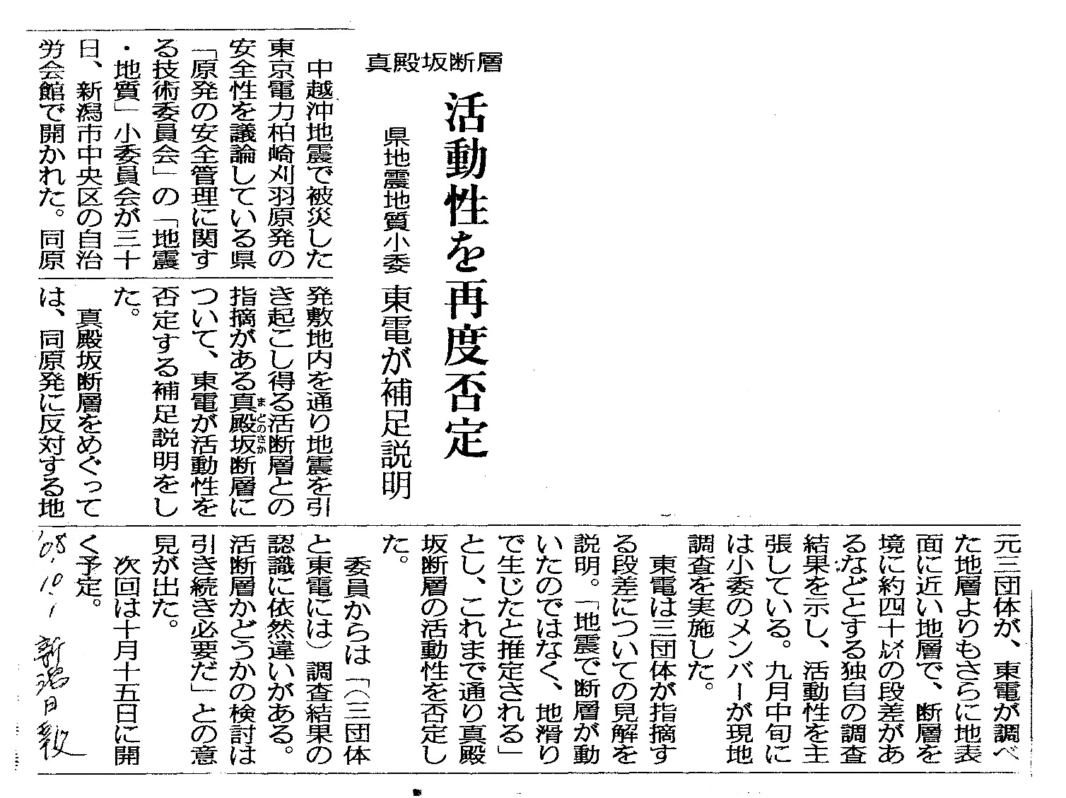 [2008_10_01_03]真殿坂断層 活動性を再度否定 県地震地質小委 東電が補足説明(新潟日報2008年10月1日)