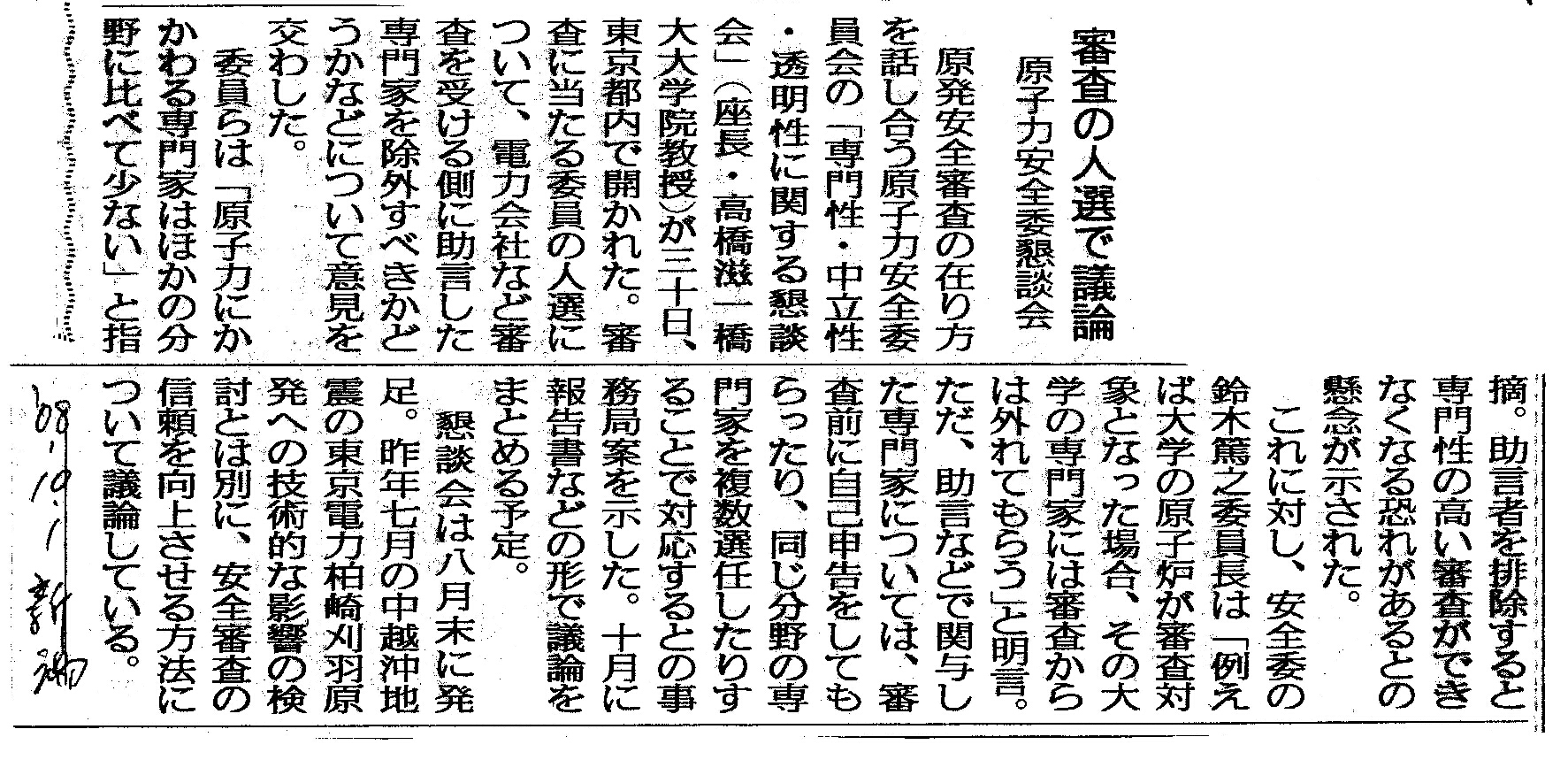 [2008_10_01_04]審査の人選で議論 原子力安全委懇談会(新潟日報2008年10月1日)
