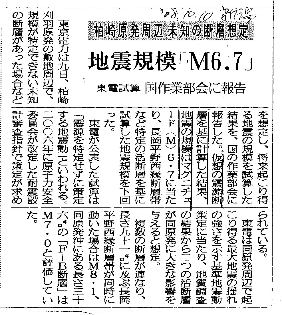 [2008_10_10_01]柏崎原発周辺未知の活断層想定 地震規模「M6.7」 東電試算 国産業部会に報告(新潟日報2008年10月10日)
