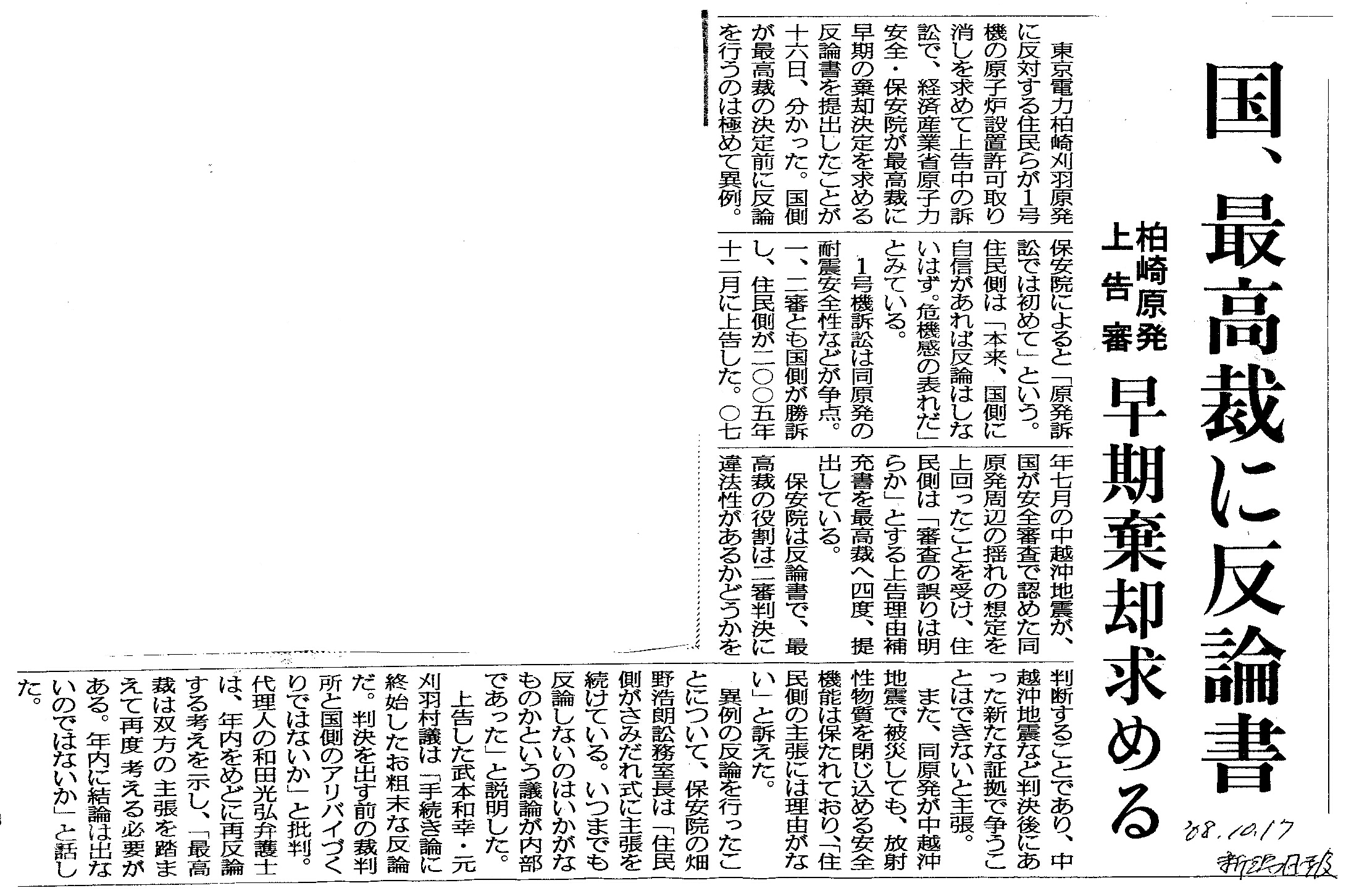 | [2008_10_17_01]国、最高裁に反論書 柏崎原発上告審 早期棄却求める(新潟日報2008年10月17日) |
