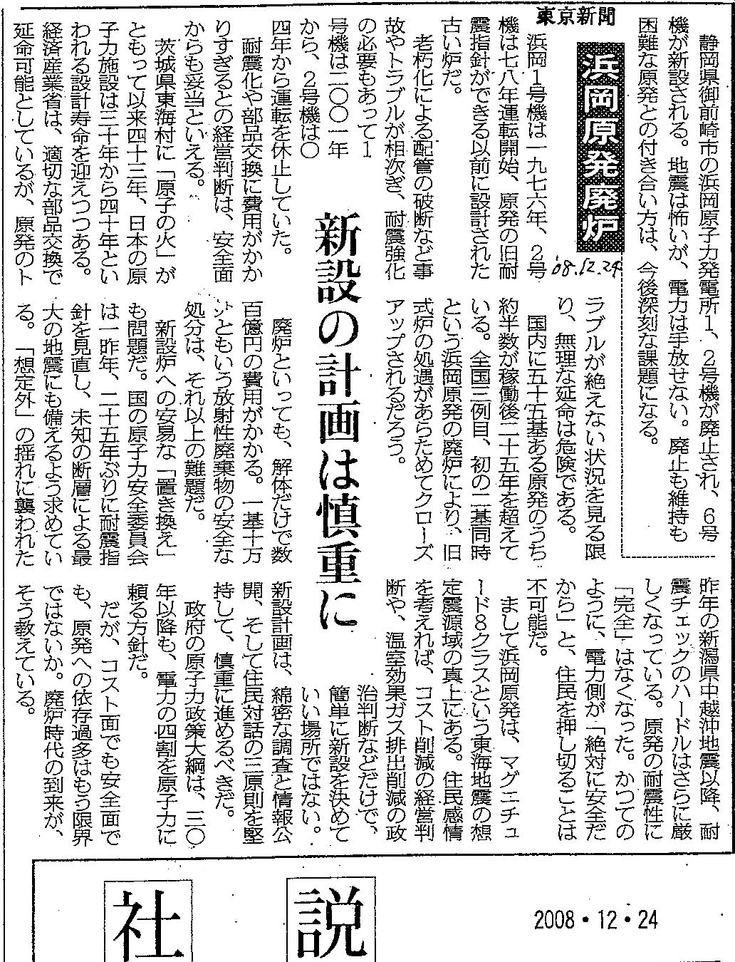 [2008_12_24_01]社説 浜岡原発廃炉 新設の計画は慎重に(東京新聞2008年12月24日)