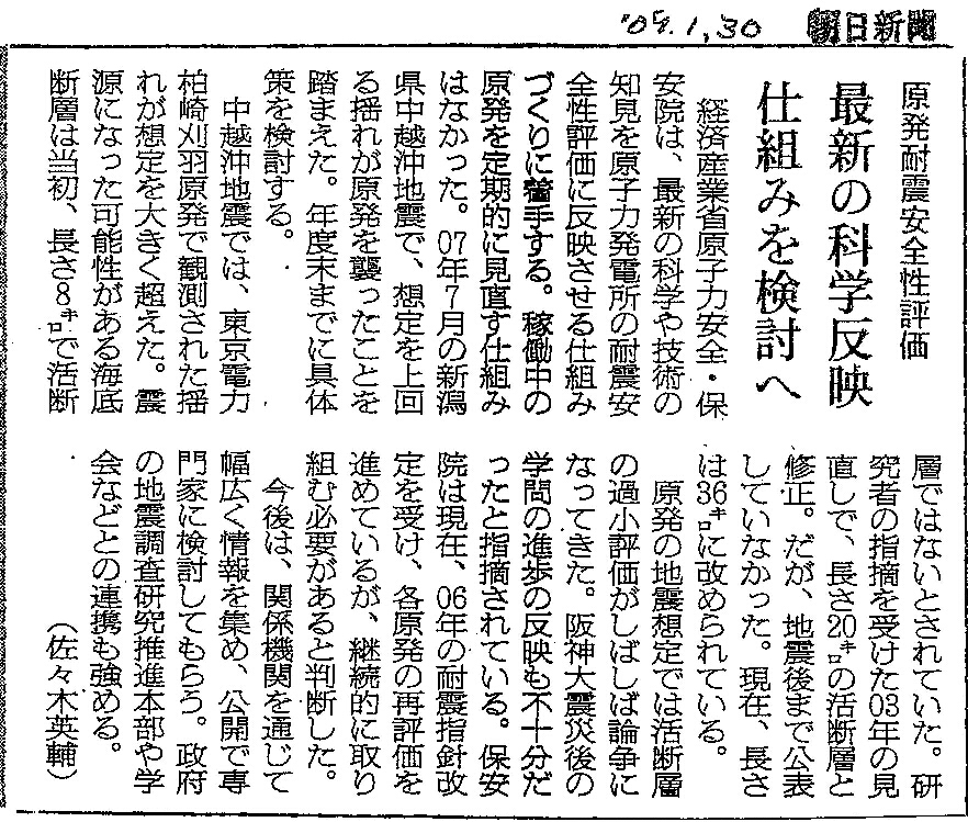 | [2009_01_30_01]原発耐震安全性評価 最新の科学反映 仕組みを検討へ(朝日新聞2009年1月30日) |