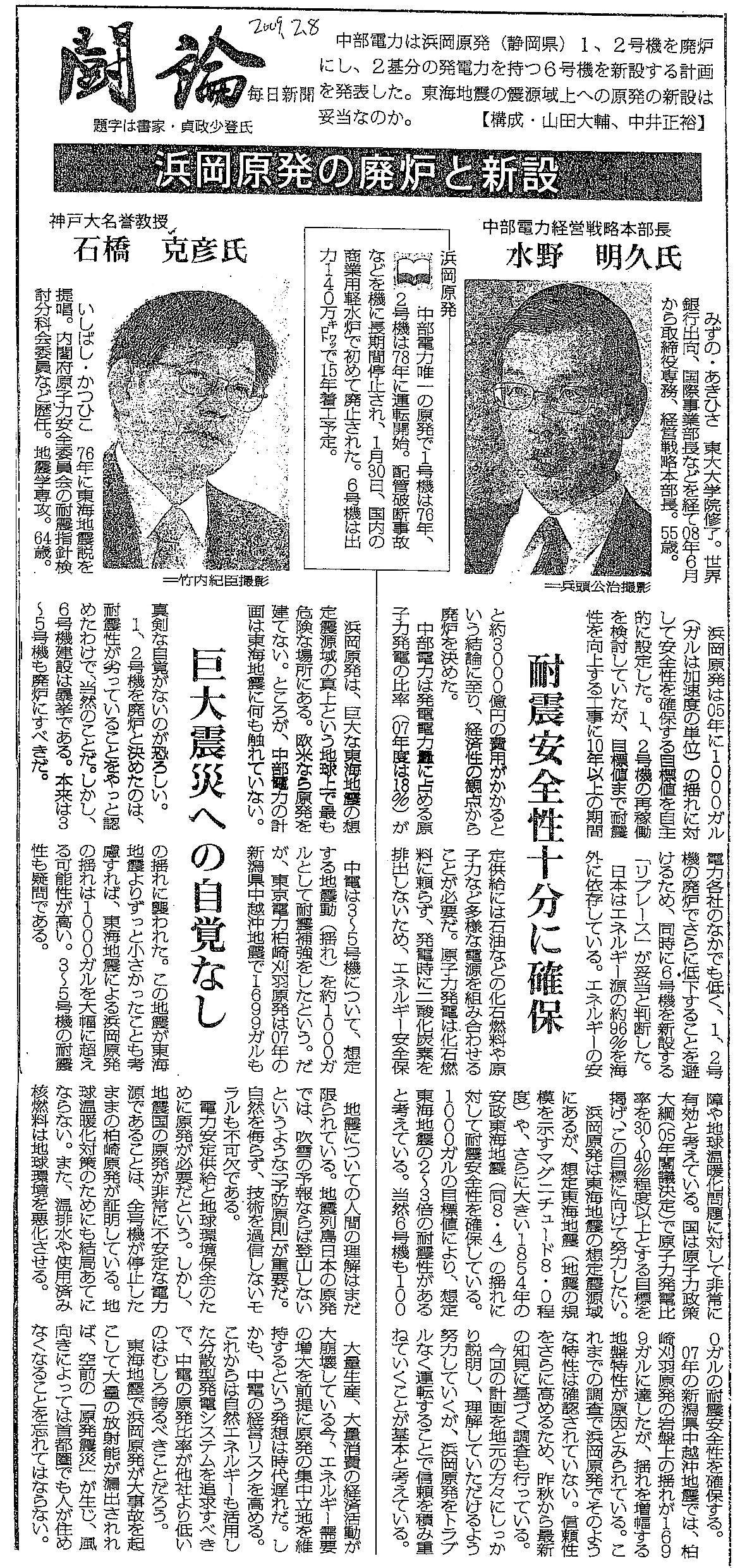 [2009_02_08_01]闘論 浜岡原発の廃炉と新設 神戸大名誉教授 石橋克彦氏 巨大震災への自覚なし 中部電力経営戦略本部長 水野明久氏 耐震安全性十分に確保(朝日新聞2009年2月8日)