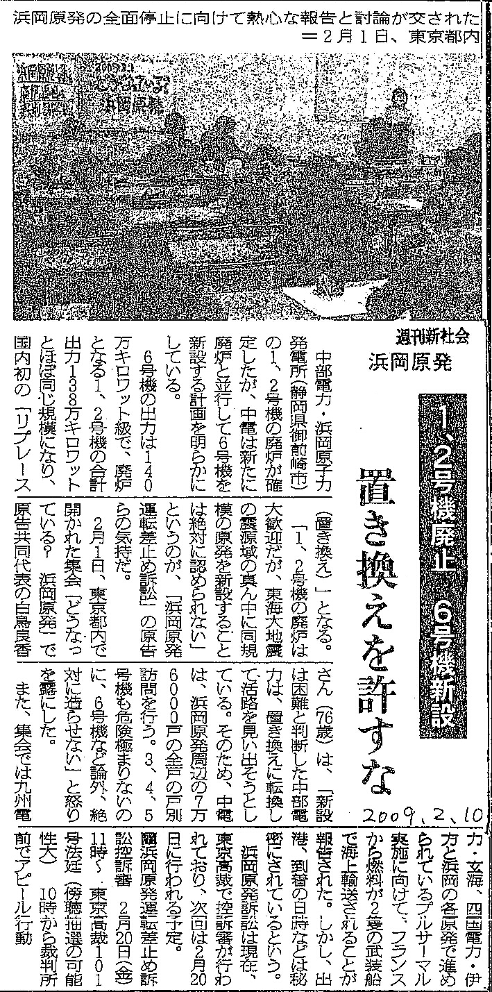 [2009_02_10_02]浜岡原発 1,2号機廃止 6号機新設 置き換えを許すな(週刊新社会2009年2月10日)