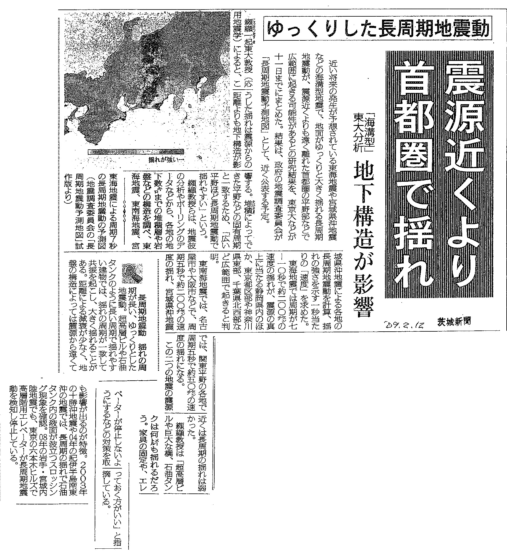 | [2009_02_12_01]ゆっくりとした長周期地震動 震源近くより首都圏で揺れ 「海溝型」東大分析 地下構造が影響(茨城新聞2009年2月12日) |