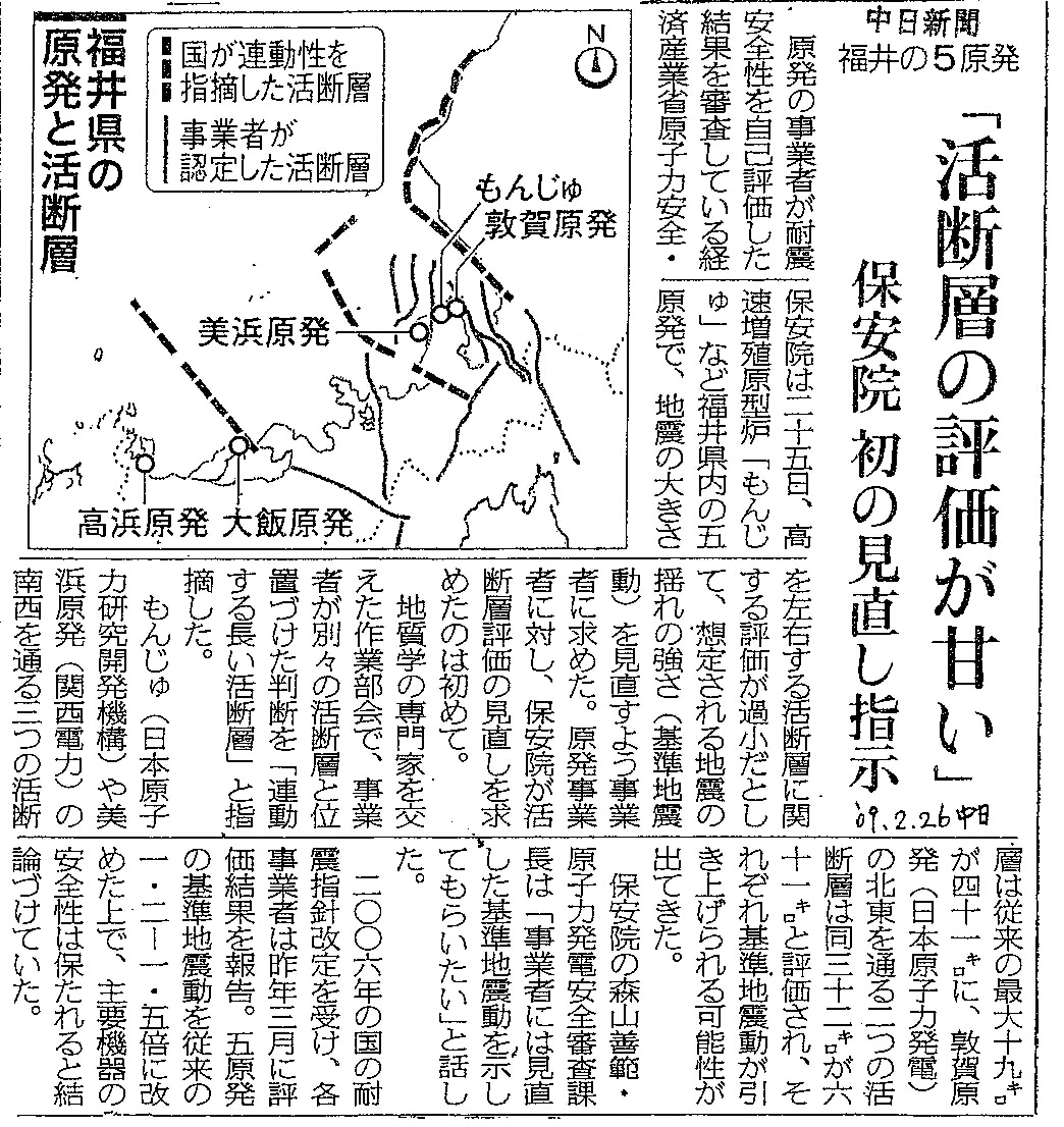 | [2009_02_26_01]福井の5原発 「活断層の評価が甘い」 保安院の見直し指示(中日新聞2009年2月26日) |