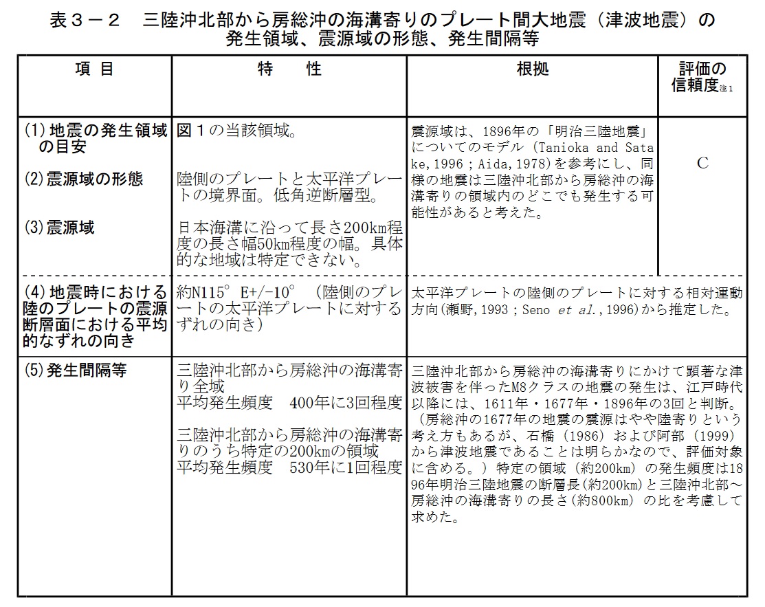 ※引用者注:以下は東日本大震災に対応する長期評価の部分を抜粋したものである。 ![]() (前略) (2)三陸沖北部から房総沖の海溝寄りのプレート間大地震(津波地震*2) 三陸沖北部から房総沖の海溝寄りの領域については、過去にM8クラスの地震が幾つか知られている。そのうち1933年の三陸沖のものはプレート内で発生した正断層型の地震であり性質が異なるため次の項目で扱うこととし、ここではそれ以外の大地震を評価した。 日本海溝付近のプレート間で発生したM8クラスの地震は17世紀以降では、1611年の三陸沖、1677年11月の房総沖、明治三陸地震と称される1896年の三陸沖(中部海溝寄り)が知られており、津波等により大きな被害をもたらした。よって、三陸沖北部〜房総沖全体では同様の地震が約400年に3回発生しているとすると、133年に1回程度、M8クラスの地震が起こったと考えられる。これらの地震は、同じ場所で繰り返し発生しているとは言いがたいため、固有地震としては扱わなかった。三陸沖北部から房総沖の海溝寄りのプレート間大地震の発生領域、震源域の形態、発生間隔等は表3−2にまとめた。 ![]() *2 「津波地震」とは、断層が通常よりゆっくりとずれて、人が感じる揺れが小さくても、発生する津波の規模が大きくなるような地震のことである。この報告書では、Mt の値がMの値に比べ 0.5 以上大きい(阿部,1988)か、津波による顕著な災害が記録されているにも係わらず顕著な震害が記録されていないものについて津波地震として扱うことにした。1896 年の明治三陸地震津波を引き起こした地震が津波地震の例として有名である。 (後略) 注1:評価の信頼度は、評価に用いたデータの量的・質的な充足性などから、評価の確からしさを相対的にランク付けしたもので、AからDの4段階で表す。各ランクの一般的な意味は次のとおりである。 A:(信頼度が)高い B:中程度 C:やや低い D:低い 評価の信頼度は、想定地震の発生領域、規模、発生確率のそれぞれの評価項目について与える。なお、発生領域の評価の信頼度ランクの具体的な意味は以下のとおりである。分類の詳細な方法については(付表)を参照のこと。 発生領域の評価の信頼度 A:過去の地震から領域全体を想定震源域とほぼ特定できる。ほぼ同じ震源域で地震が繰り返し発生しており、発生領域の信頼性は高い。 B:過去の地震から領域全体を想定震源域とほぼ特定できる。ほぼ同じ震源域での地震の繰り返しを想定でき、発生領域の信頼性は中程度である。または、想定地震と同様な地震が領域内のどこかで発生すると考えられる。想定震源域を特定できないため、発生領域の信頼性は中程度である。 C:発生領域内における地震は知られていないが、ほぼ領域全体もしくはそれに近い大きさの領域を想定震源域と推定できる(地震空白域*1)。過去に地震が知られていないため、発生領域の信頼性はやや低い。または、想定地震と同様な地震が領域内のどこかで発生すると考えられる。想定震源域を特定できず、過去の地震データが不十分であるため発生領域の信頼性はやや低い。 D:発生領域内における地震は知られていないが、領域内のどこかで発生すると考えられる。ただし、地震学的知見が不十分なため発生領域の信頼性は低い。 |