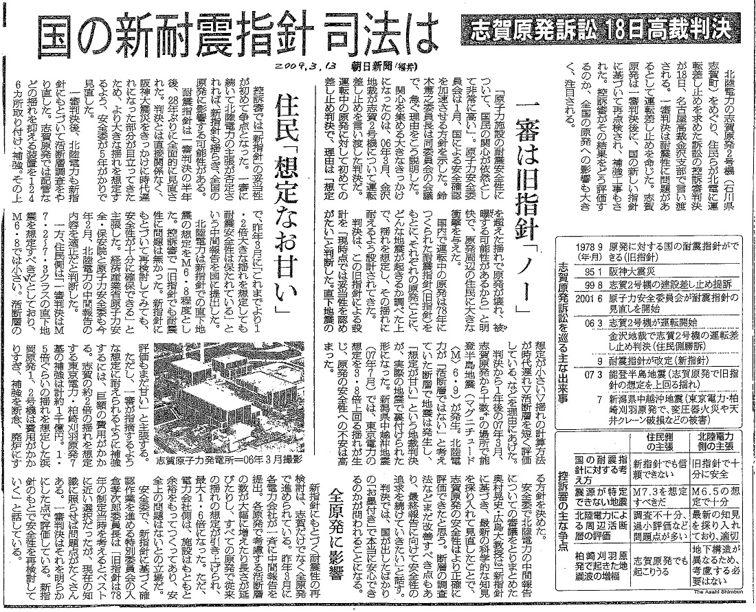 | [2009_03_13_01]志賀原発訴訟 18日高裁判決 国の新耐震市指針 司法は 一審は旧指針「ノー」 住民「想定なお甘い」 全原発に影響(朝日新聞2009年3月13日) |