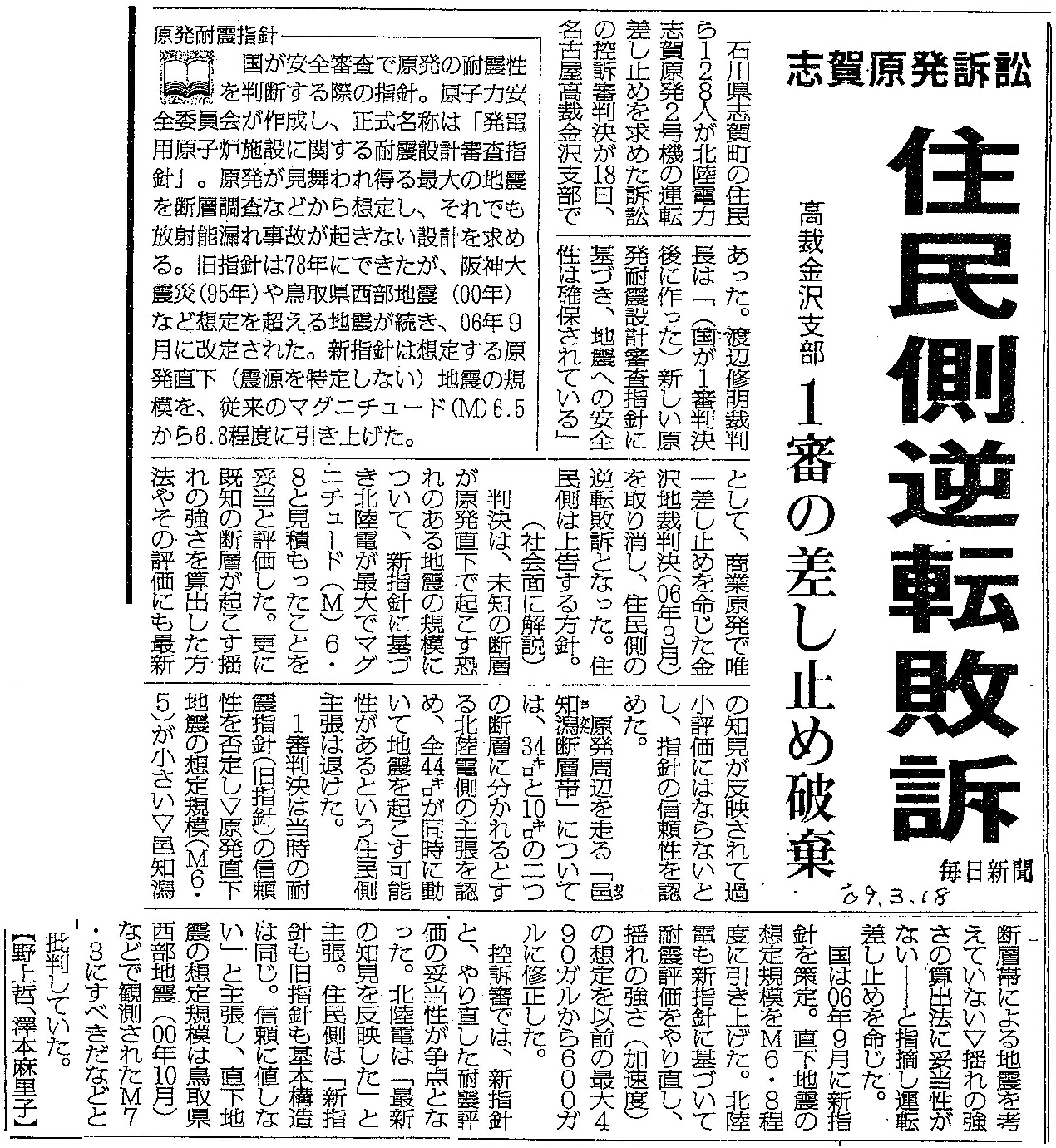 | [2009_03_18_02]志賀原発訴訟 住民側逆転敗訴 高裁金沢支部 1審の差し止め破棄(毎日新聞2009年3月18日) |