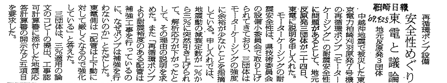 [2009_04_25_01]再循環ポンプ設備 安全性めぐり 東電と議論 地元反原発3団体(柏崎日報2009年4月25日)