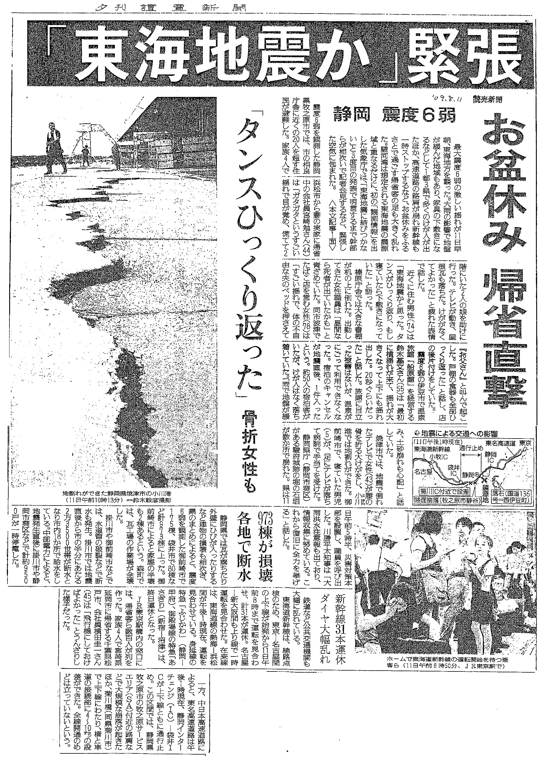 [2009_08_11_02]「東海地震か」緊張 静岡 震度6弱 お盆休み 帰省直撃 「タンスひっくり返った」 骨折女性も 973棟が損壊 各地で断水 新幹線31本運休 ダイヤ大幅乱れ(読売新聞2009年8月11日)
