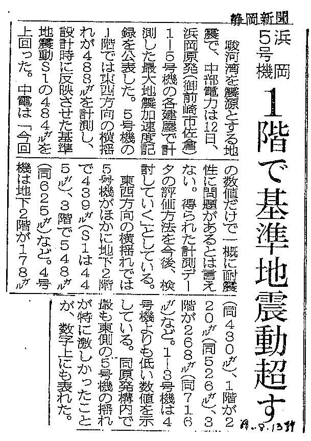 [2009_08_13_01]浜岡5号機 1階で基準地震動超す(静岡新聞2009年8月13日)