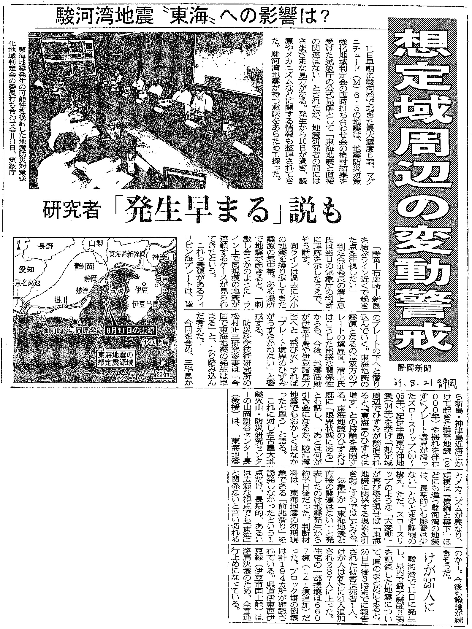 [2009_08_21_01]駿河湾地震”東海”への影響は? 想定域周辺の変動警戒 研究者「発生早まる」説も(静岡新聞2009年8月21日)