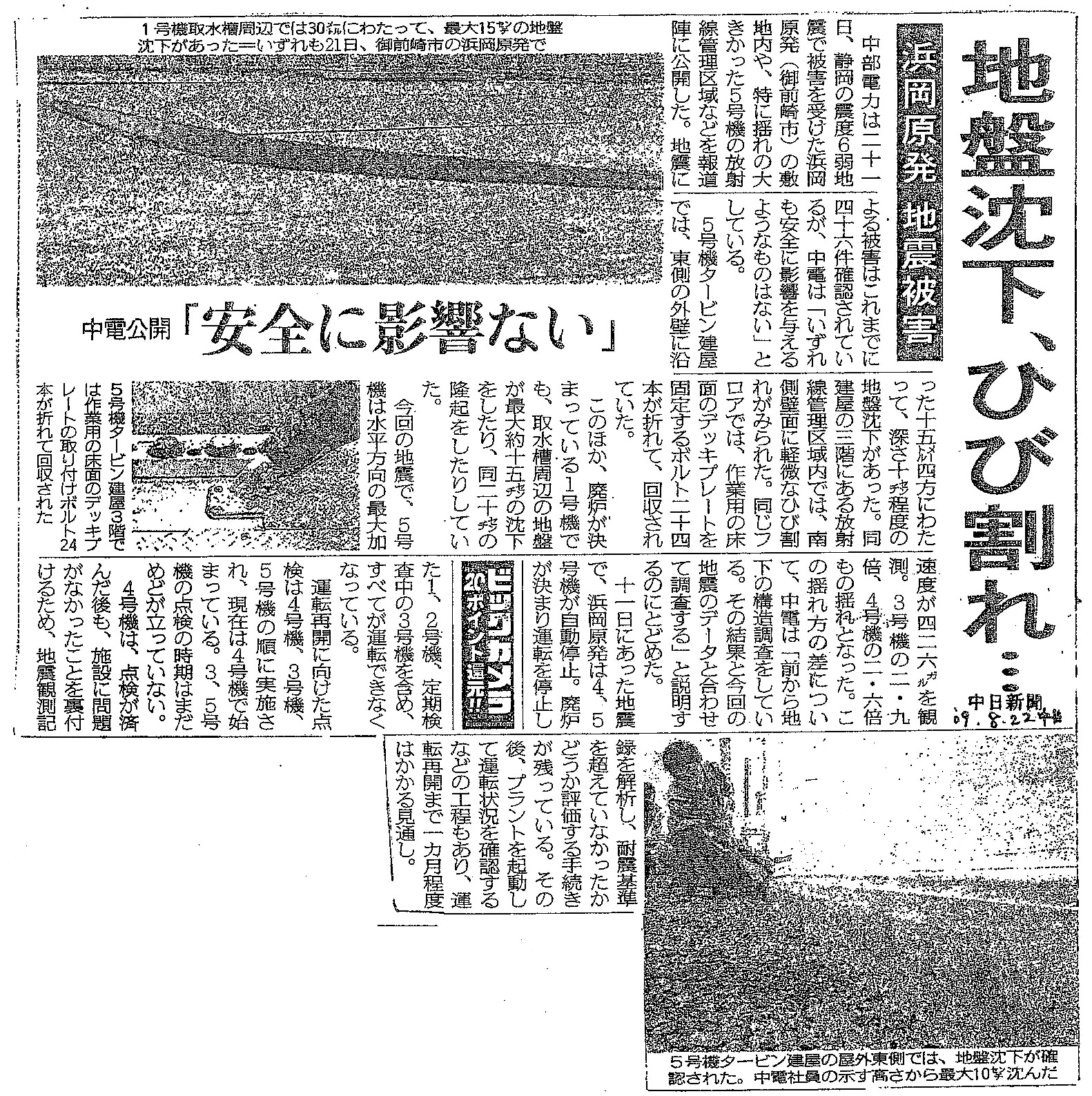 [2009_08_22_02]浜岡原発 地震被害 地盤沈下、ひび割れ・・・ 中電公開「安全に影響ない」(中日新聞2009年8月22日)