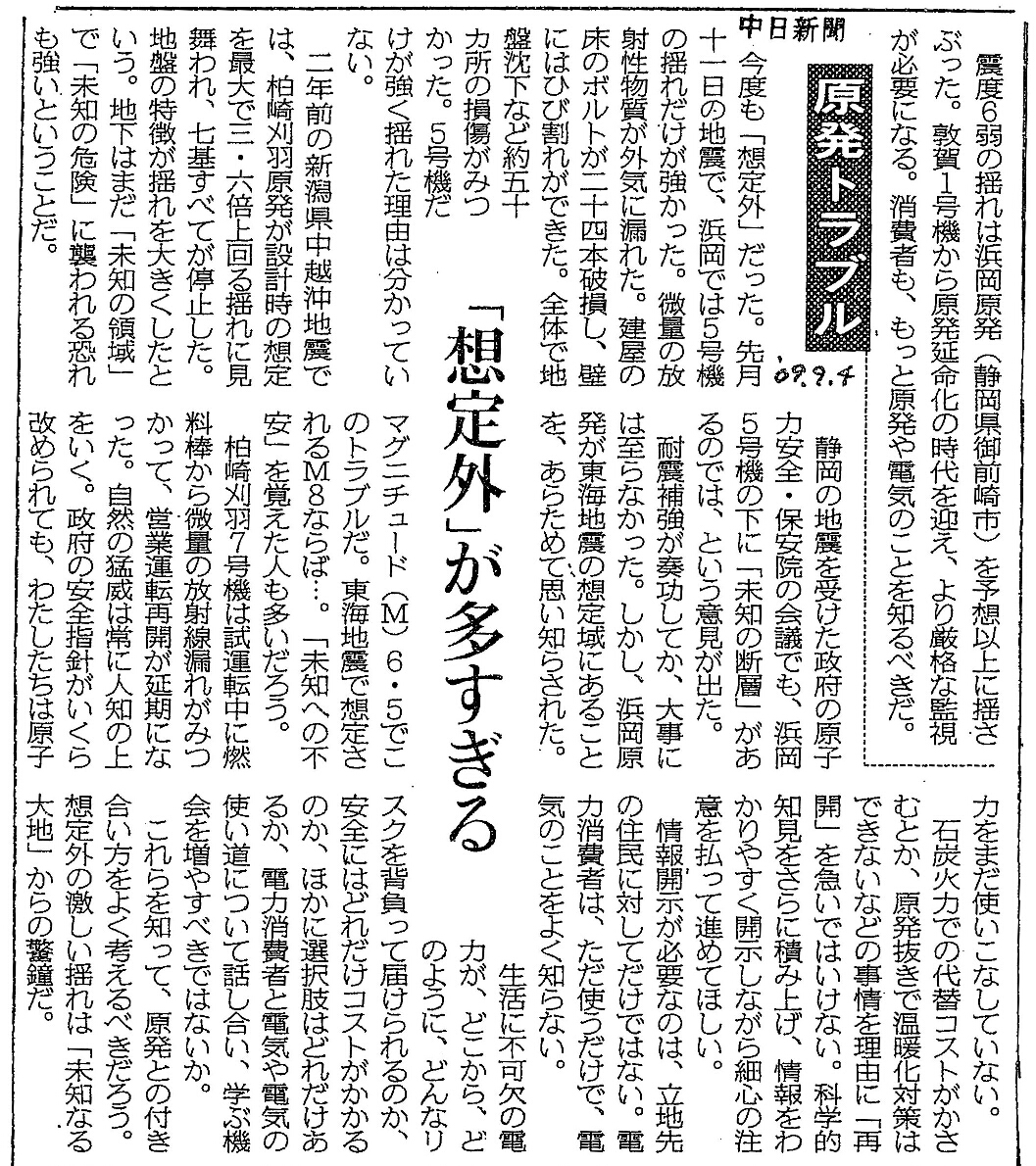 [2009_09_04_01]原発トラブル 「想定外」が多すぎる(中日新聞2009年9月4日)