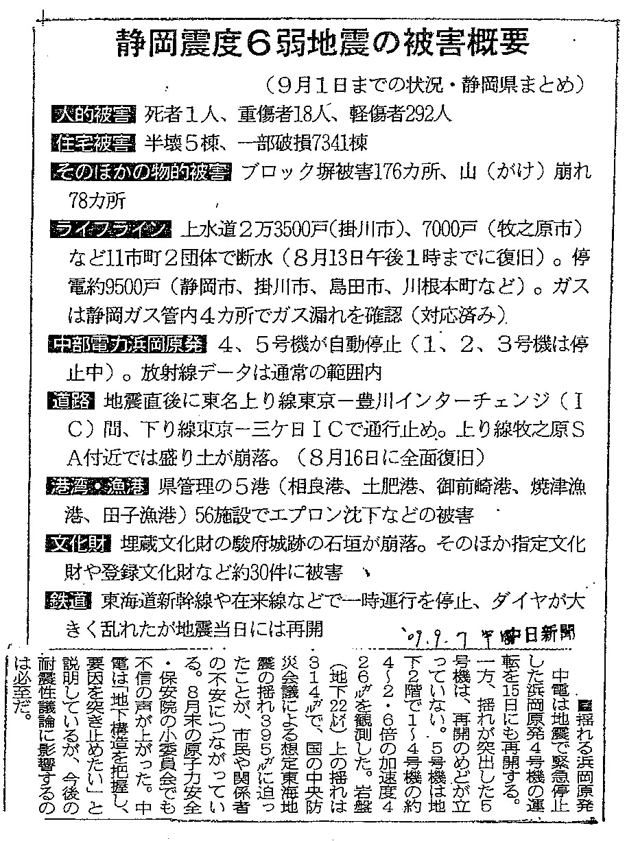 [2009_09_07_01]静岡震度6弱地震の被害概要 揺れる浜岡原発(中日新聞2009年9月7日)
