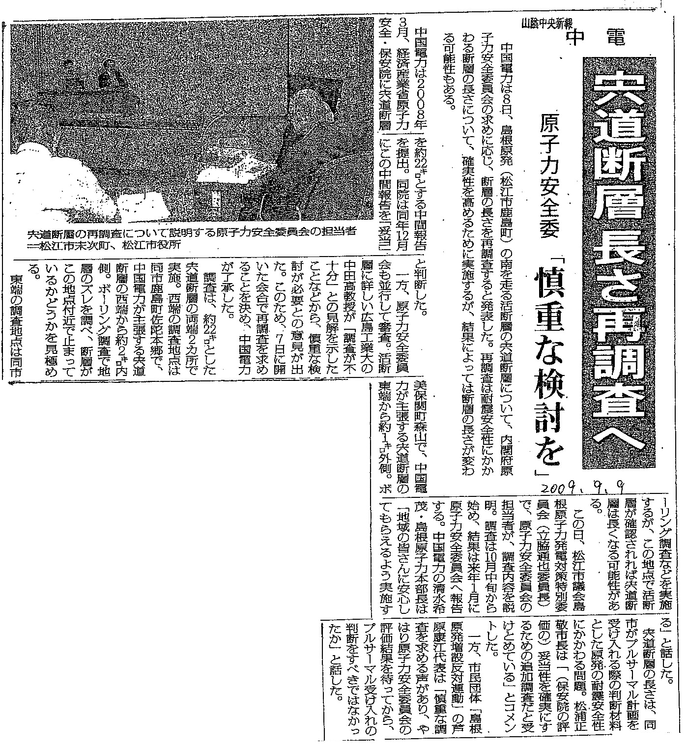[2009_09_09_01]中電 宍道断層 長さ再調査へ 原子力安全委「慎重な検討を」(山陰中央新報2009年9月9日)