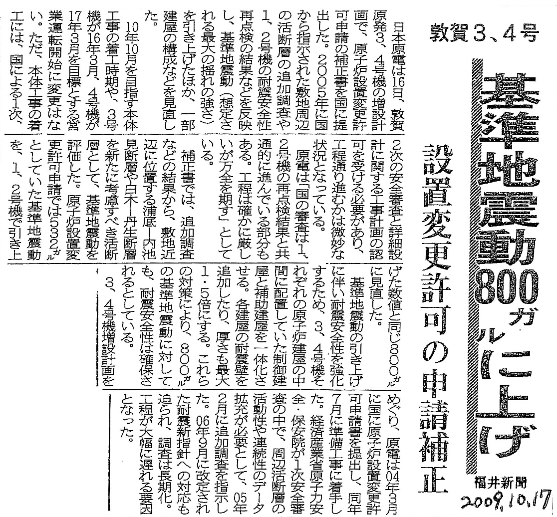 | [2009_10_17_01]敦賀3,4号 基準地震動800ガルに上げ 設置変更許可の申請補正(福井新聞2009年10月17日) |