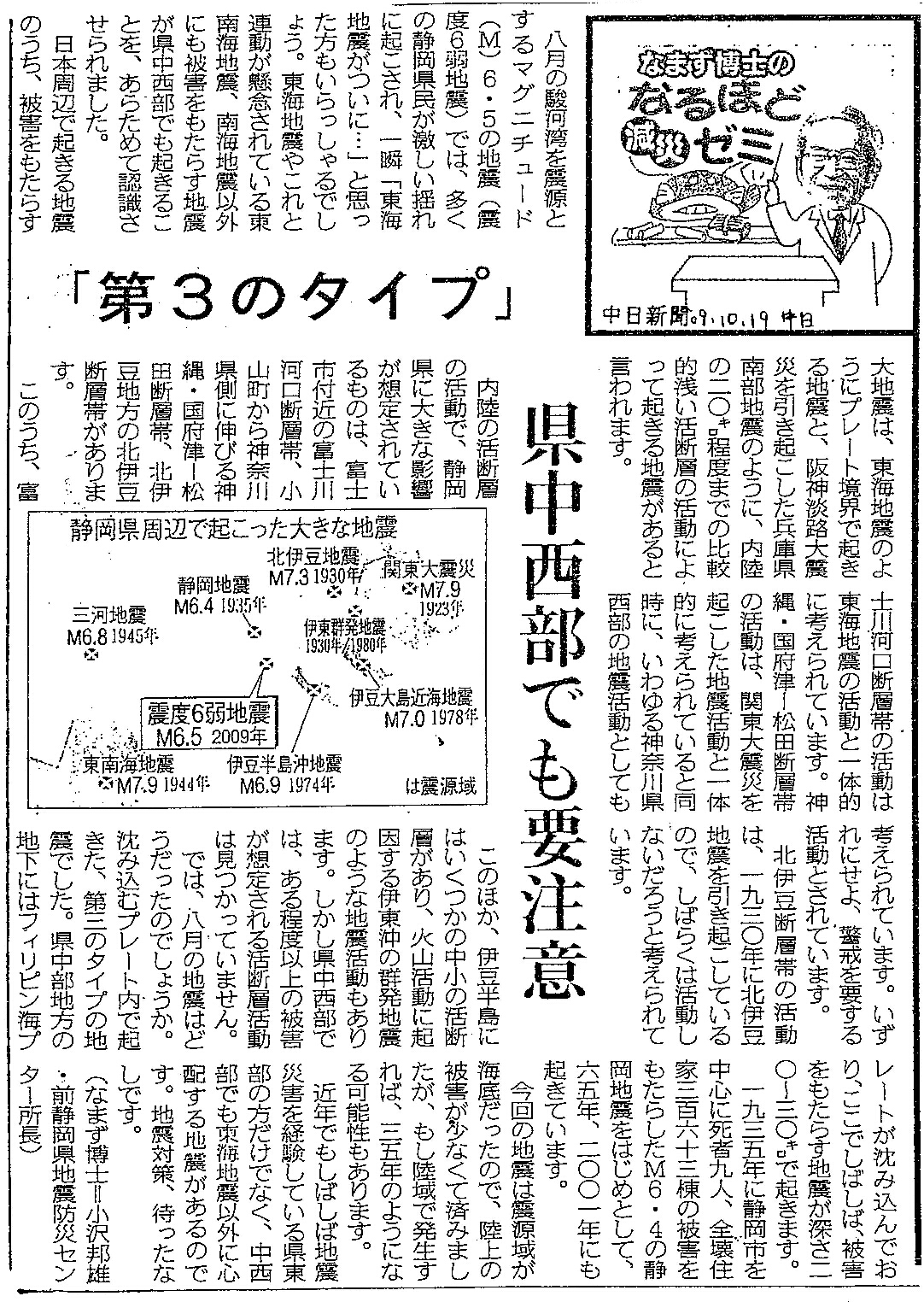 [2009_10_19_01]なまず博士のなるほど減災ゼミ 「第3のタイプ」 県中西部でも要注意(中日新聞2009年10月19日)