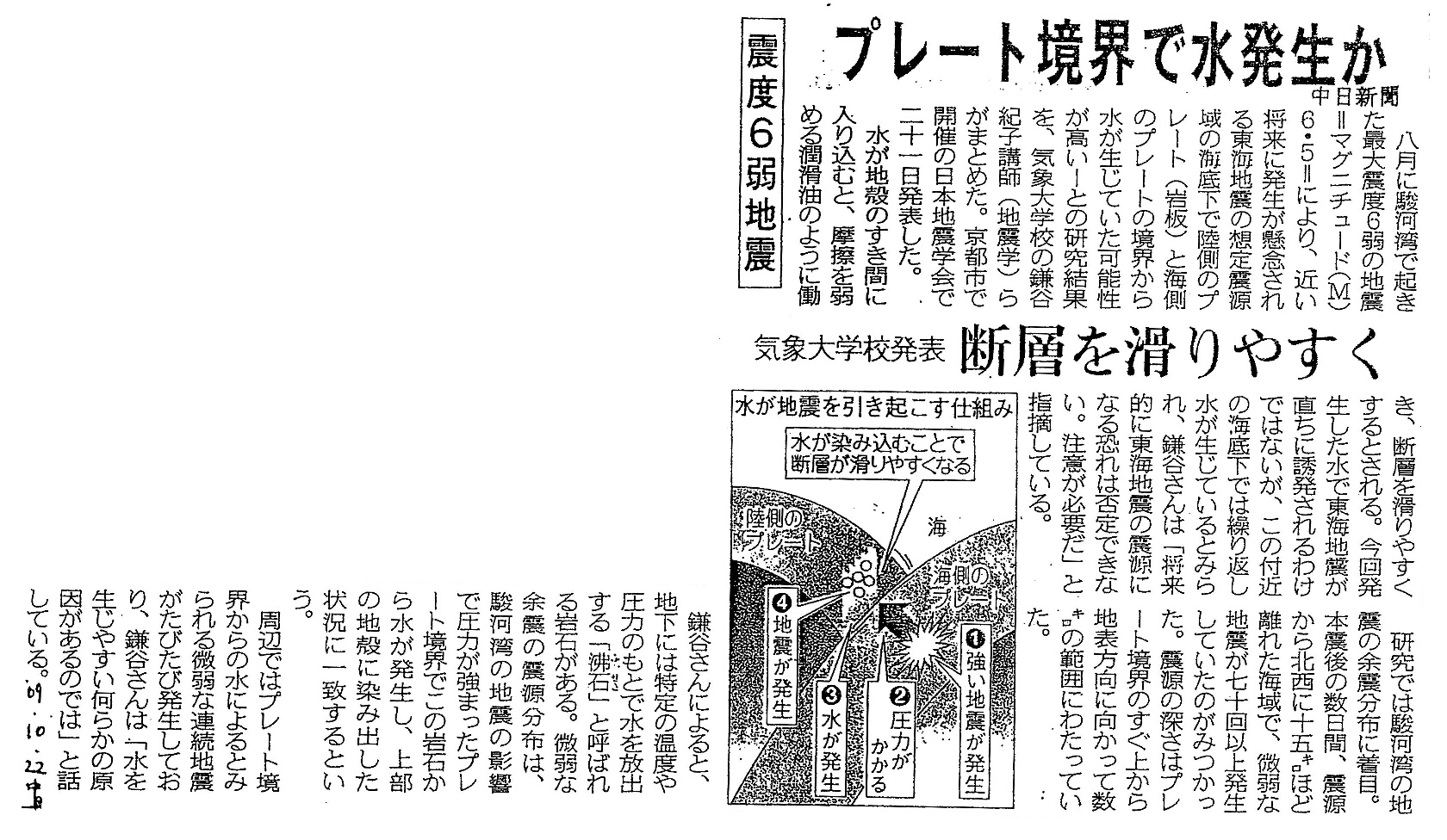 [2009_10_22_02]震度6弱地震 プレート境界で水発生か 気象大学校発表 断層を滑りやすく(中日新聞2009年10月22日)