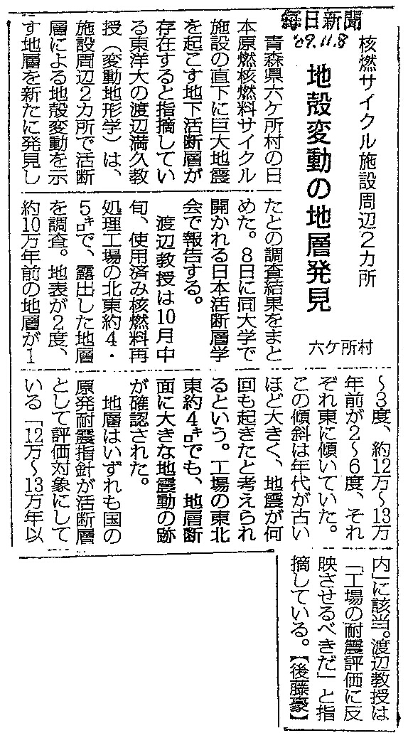 | [2009_11_08_01]核燃サイクル施設周辺2カ所 地殻変動の地層発見 六ケ所村(毎日新聞2009年11月8日) |