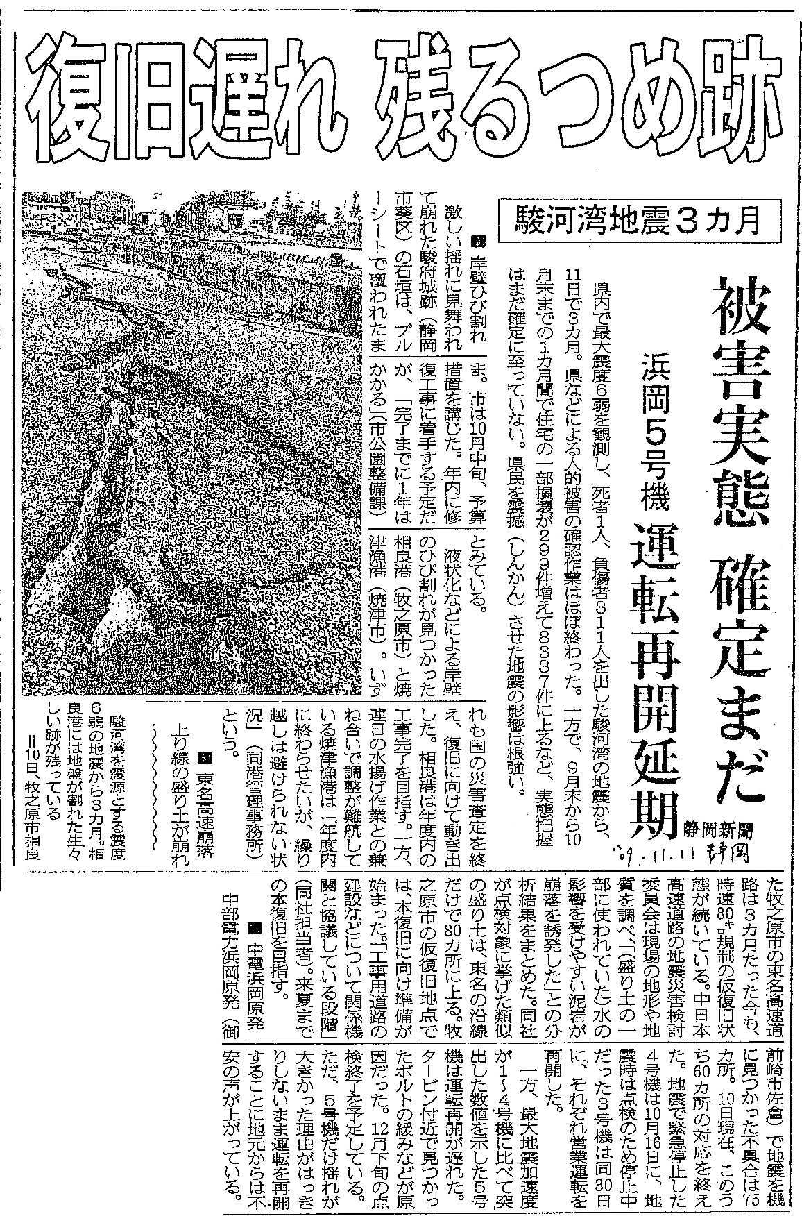 [2009_11_11_01]復旧遅れ 残るつめ跡 駿河湾地震3カ月 被害実態 確定まだ 浜岡5号機 運転再開延期 岸壁ひび割れ 東名高速崩落 中電浜岡原発(静岡新聞2009年11月11日)