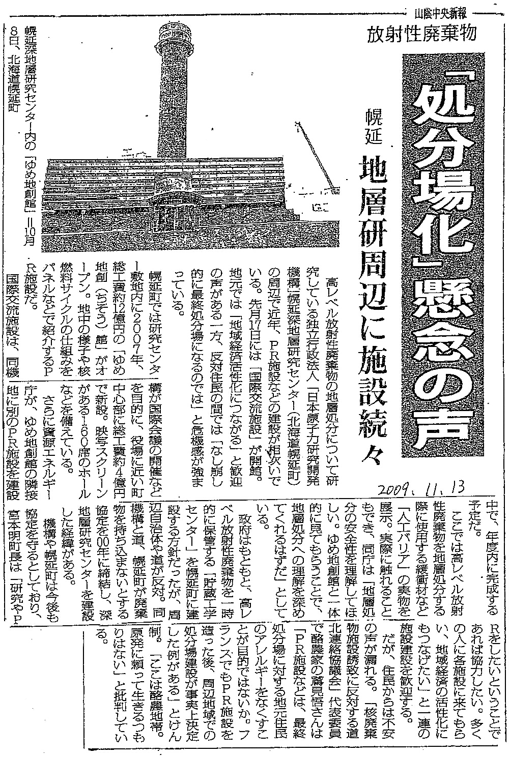 [2009_11_13_01]放射性廃棄物 「処分場化」懸念の声 幌延 地層研周辺に施設続々(山陰中央新報2009年11月13日)