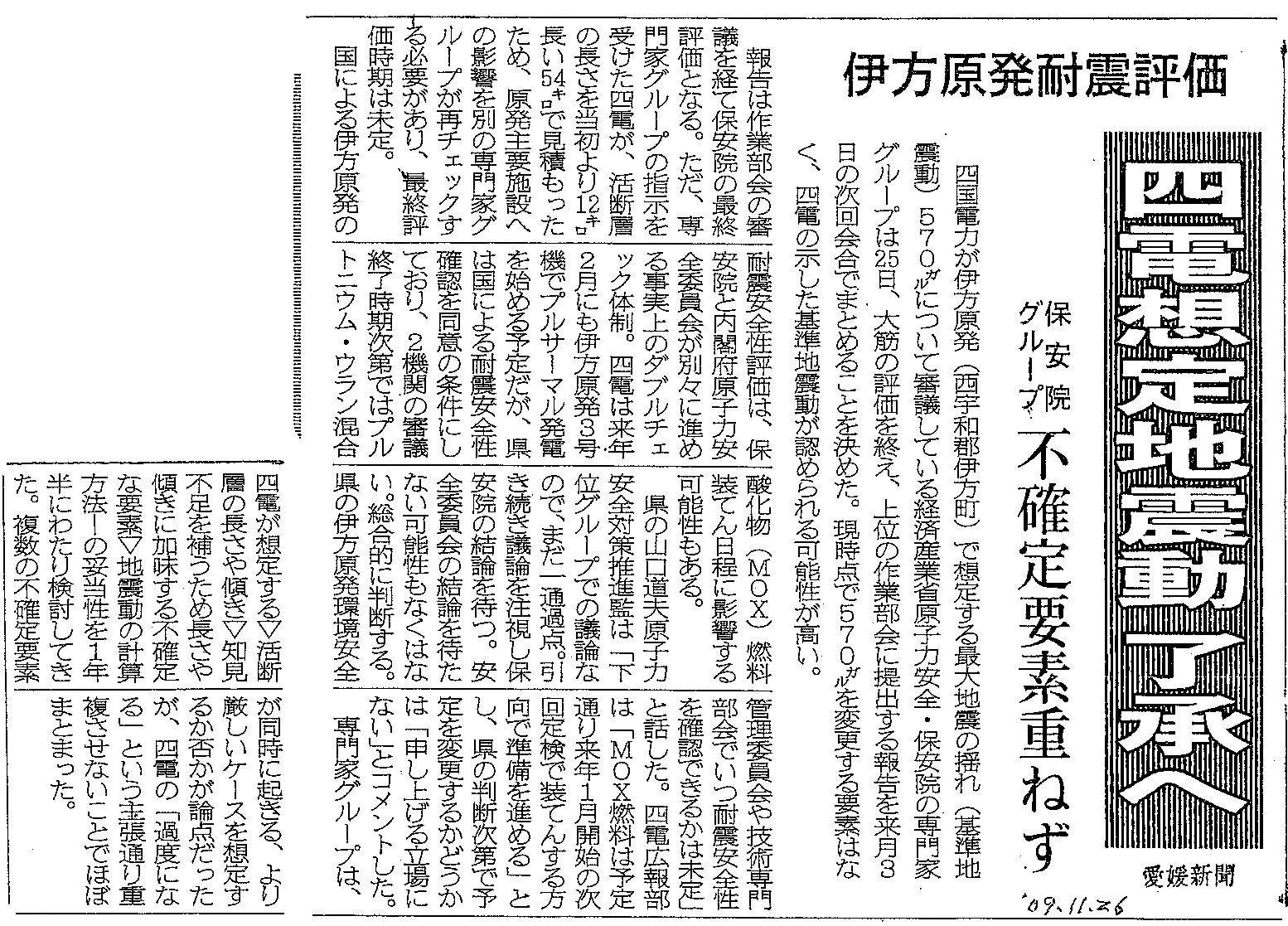 [2009_11_26_01]伊方原発耐震評価 四電想定地震動 了承へ 保安院グループ 不確定要素重ねず(愛媛新聞2009年11月26日)