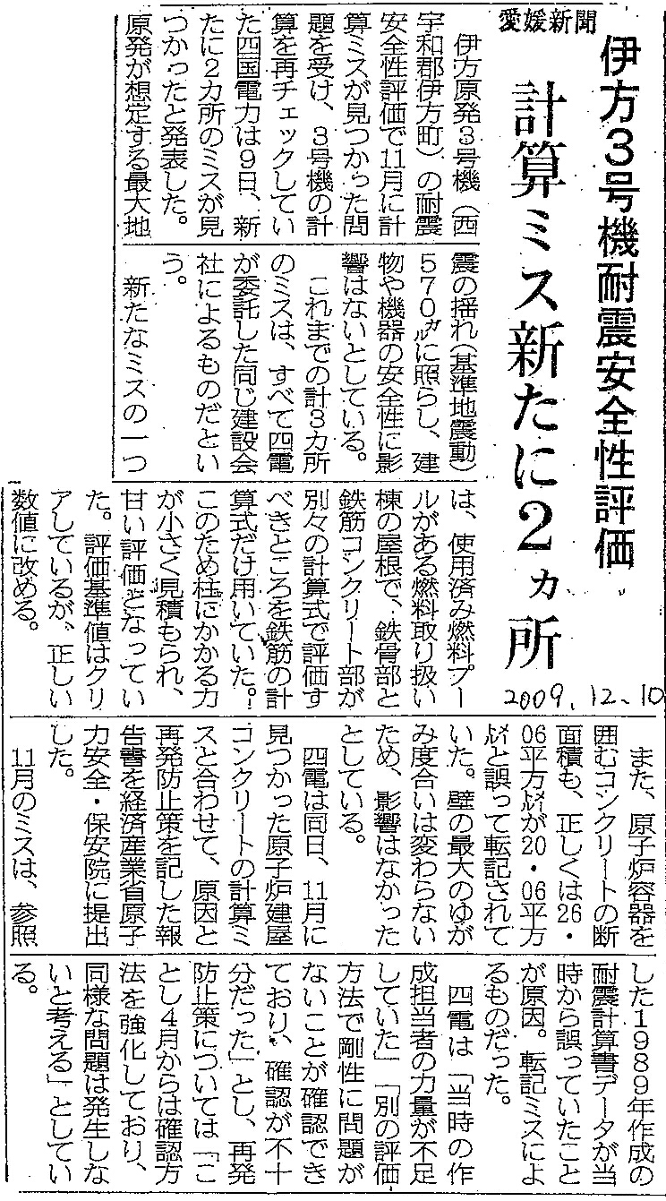[2009_12_10_01]伊方3号機耐震安全性評価 計算ミス新たに2カ所(愛媛新聞2009年12月10日)