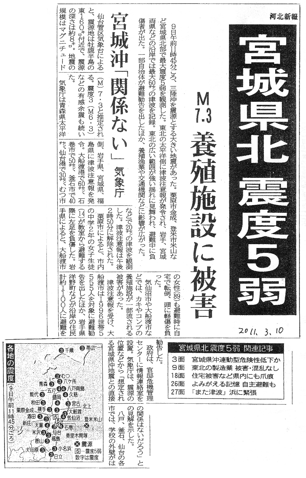 | [2011_03_10_01]宮城県北 震度5弱 M7.3 養殖施設に被害 宮城沖「関係ない」気象庁(河北新報2011年3月10日) |