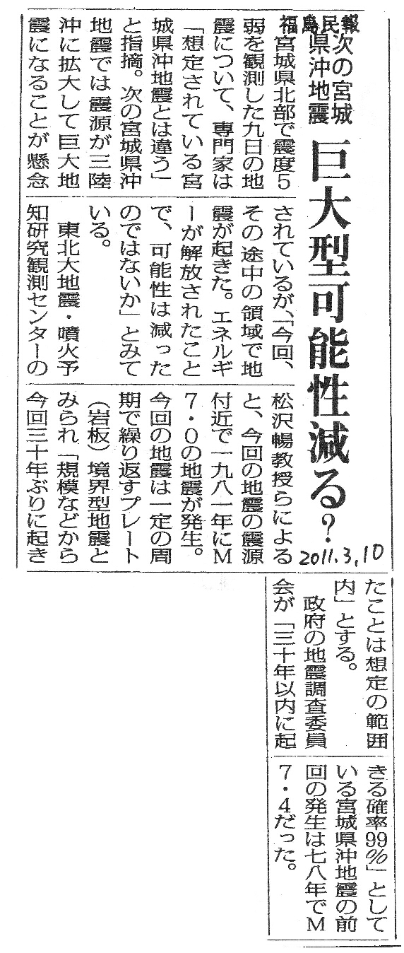 [2011_03_10_02]次の宮城県沖地震 巨大型可能性減る?(福島民報2011年3月10日)