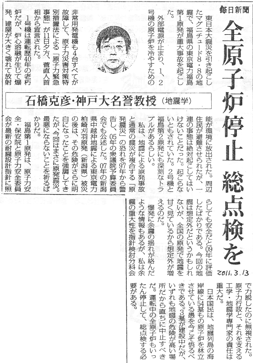 | [2011_03_13_01]全原子炉停止 総点検を 石橋克彦・神戸大学名誉教授地震学(毎日新聞2011年3月13日) |