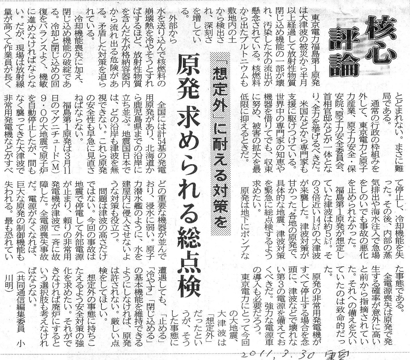 [2011_03_30_01]核心評論 「想定外」に耐える対策を 原発求められる総点検(東奥日報2011年3月30日)