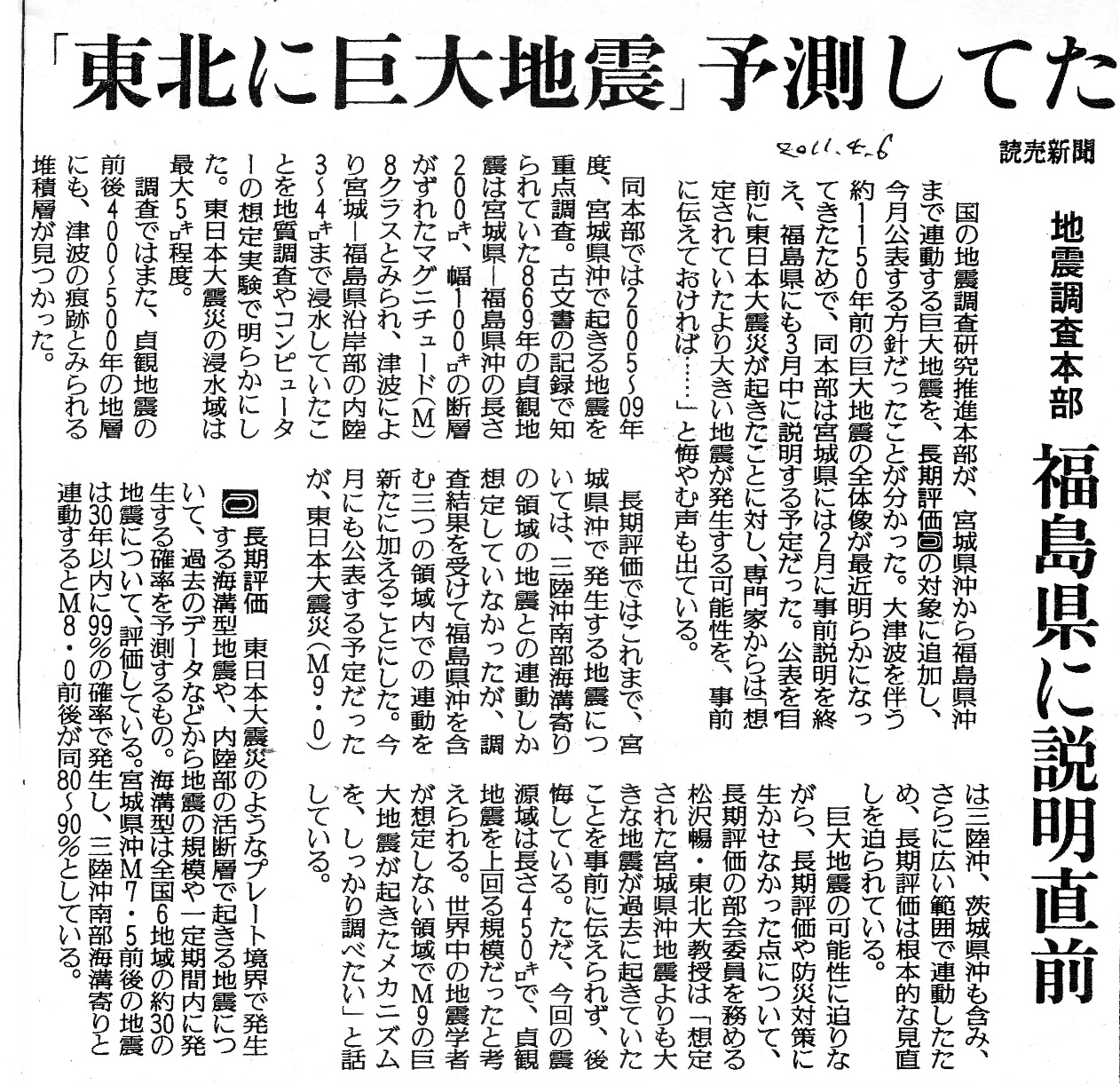 | [2011_04_06_01]「東北に巨大地震」予測していた 地震調査本部 福島県に説明直前(読売新聞2011年4月6日) |