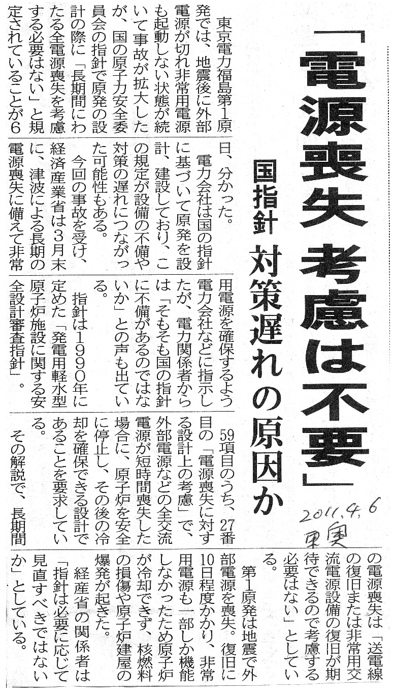 [2011_04_06_02]「電源喪失 考慮は不要」 国指針 対策遅れの原因か(東奥日報2011年4月6日)