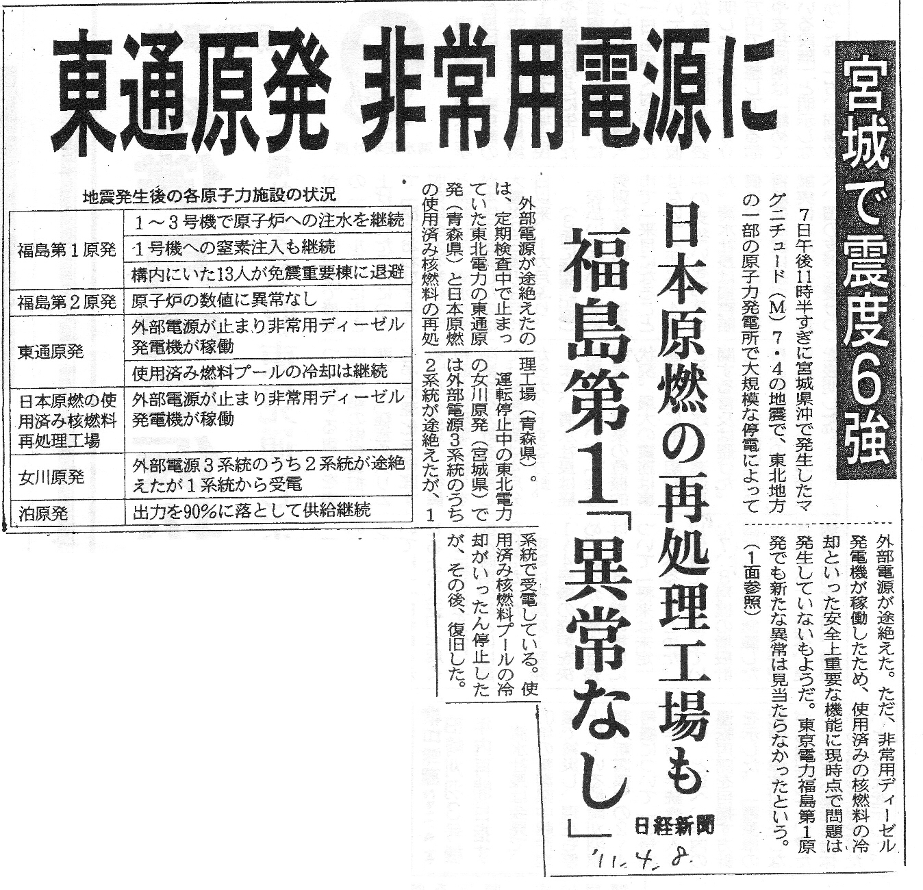 | [2011_04_08_01]宮城で震度6強 東通原発 非常用電源に 日本原燃の再処理工場も 福島第1「異常なし」(日経新聞2011年4月8日) |