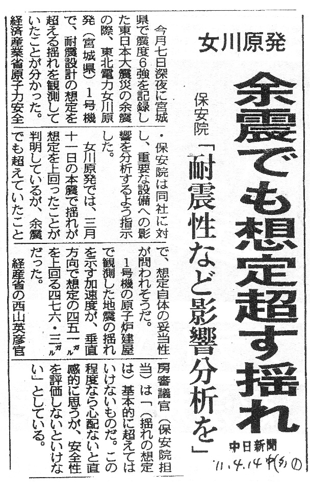 [2011_04_14_01]女川原発 余震でも想定超す揺れ 保安院 「耐震性など影響分析」(中日新聞2011年4月14日)