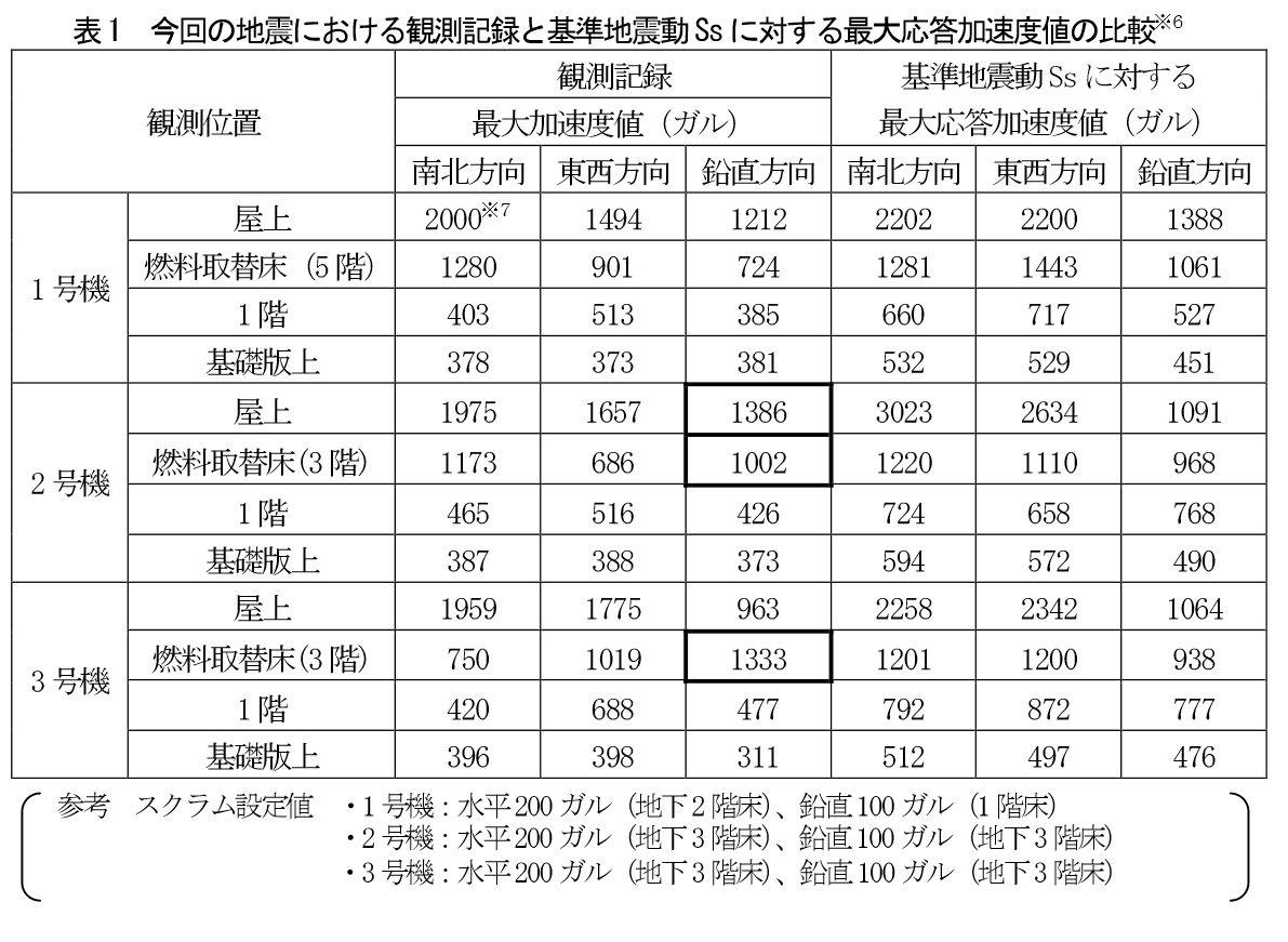 PDF形式 2ページ ※図表等を見る場合は上記の参照元をクリックしてください ※本図は「女川原子力発電所における2011年4月7日宮城県沖の地震時に取得された地震観測記録の分析結果に係わる報告書(概要)」の1ページ目の表「表1 今回の地震における観測記録と基準地震動Ssに対する最大応答加速度値の比較」を抜粋したものである ※当会による修正・強調箇所は赤色で示した