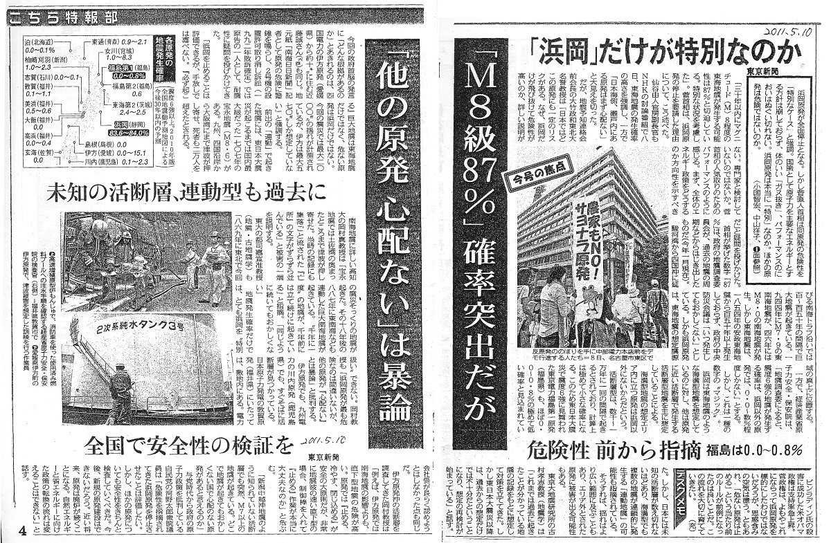 | [2011_05_10_03]「M8級87%」確率突出だが 「浜岡」だけが特別なのか 危険性 前から指摘 福島は0.0〜0.8% 「他の原発心配ない」は暴論 未知の活断層、連動型も過去に 全国で安全性の検証を(東京新聞2011年5月10日) |