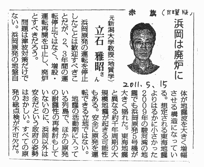[2011_05_15_01]浜岡は廃炉に 元新潟大学教授地質学立石雅昭さん(赤旗2011年5月15日)