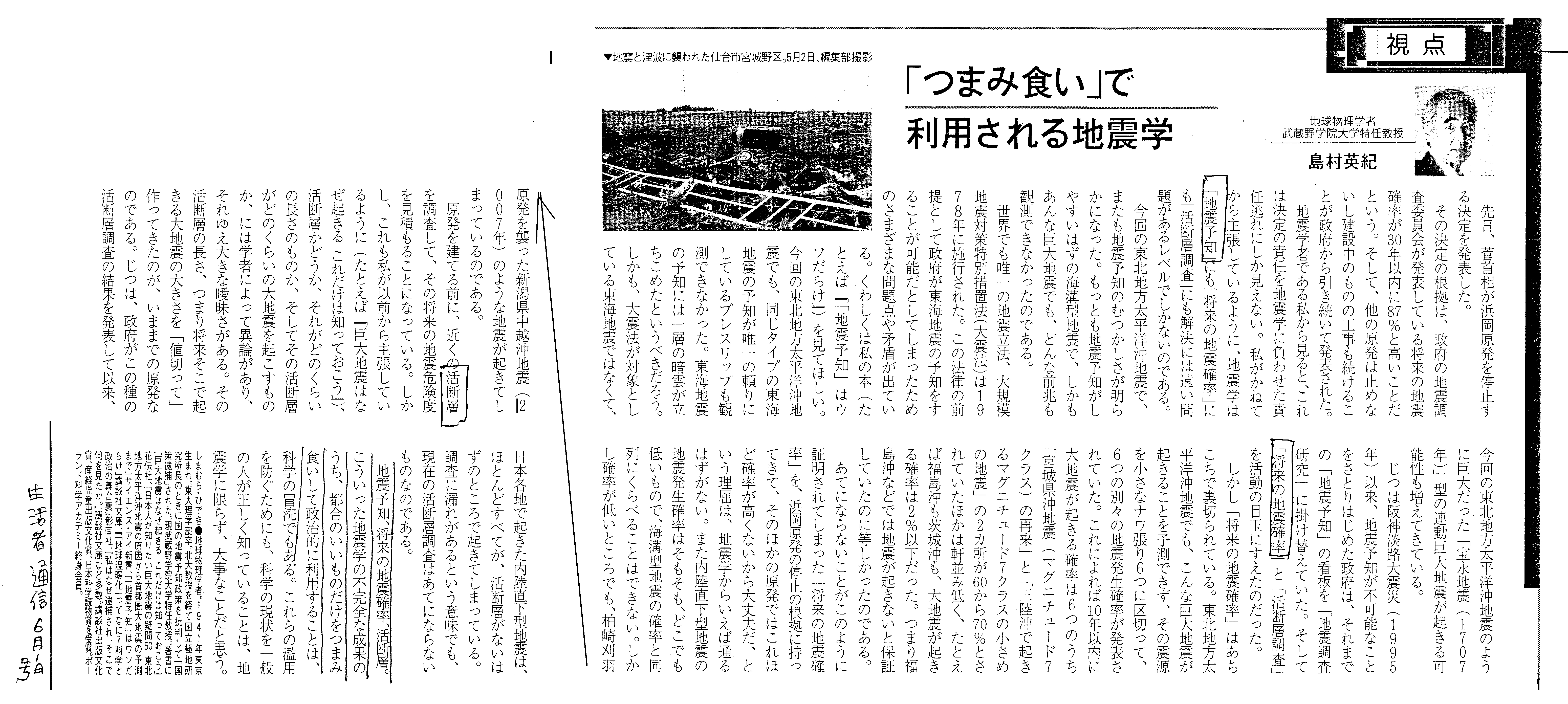 | [2011_06_01_01]島村英紀 つまみ食いで利用される地震学(生活者通信2011年6月1日) |