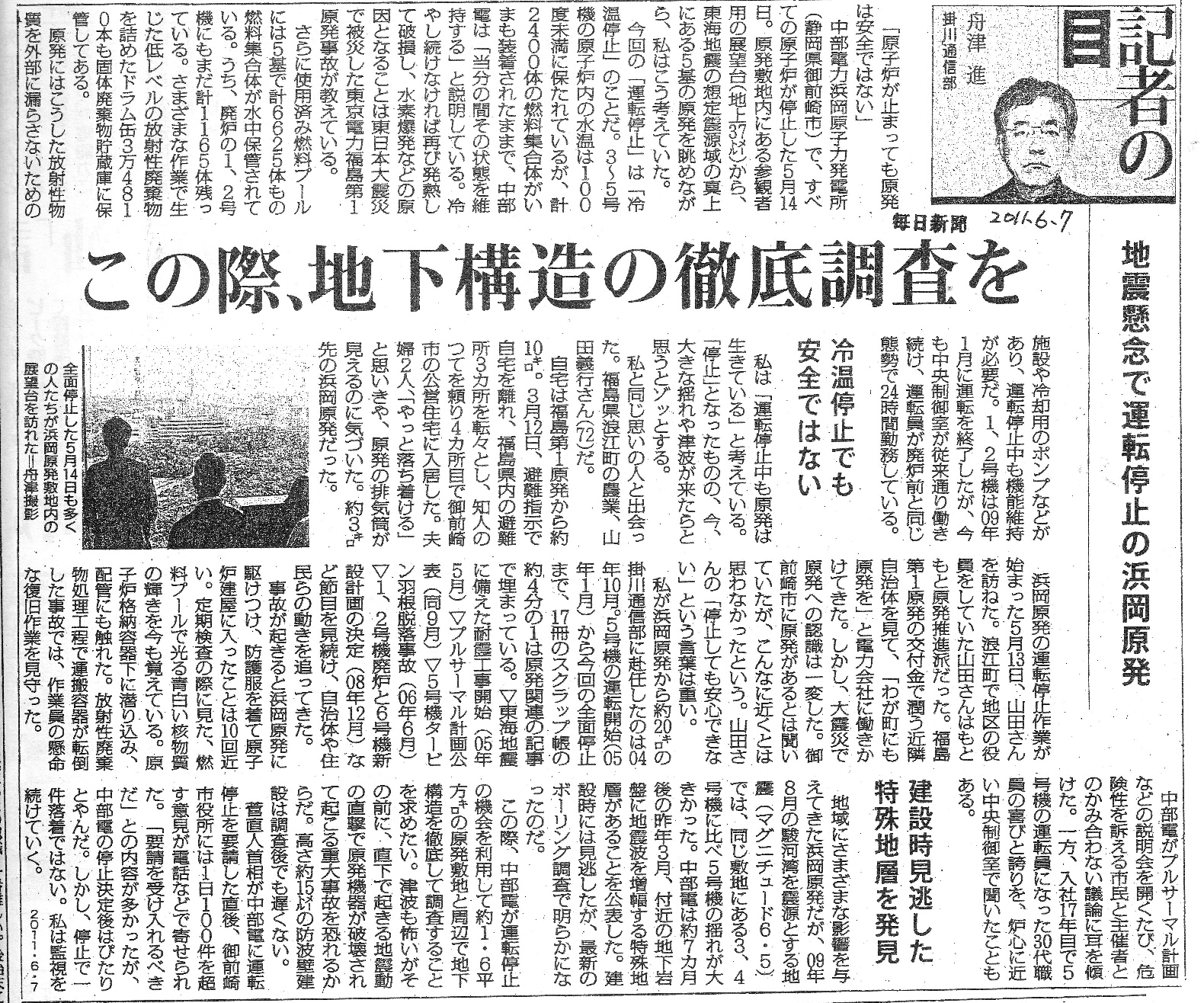 [2011_06_07_01]記者の目 船津進 掛川通信部 地震懸念で運転停止の浜岡原発 この際、地下構造の徹底調査を 冷温停止でも安全ではない 建設時見逃した特殊地層を発見 菅直人首相(毎日新聞2011年6月7日)