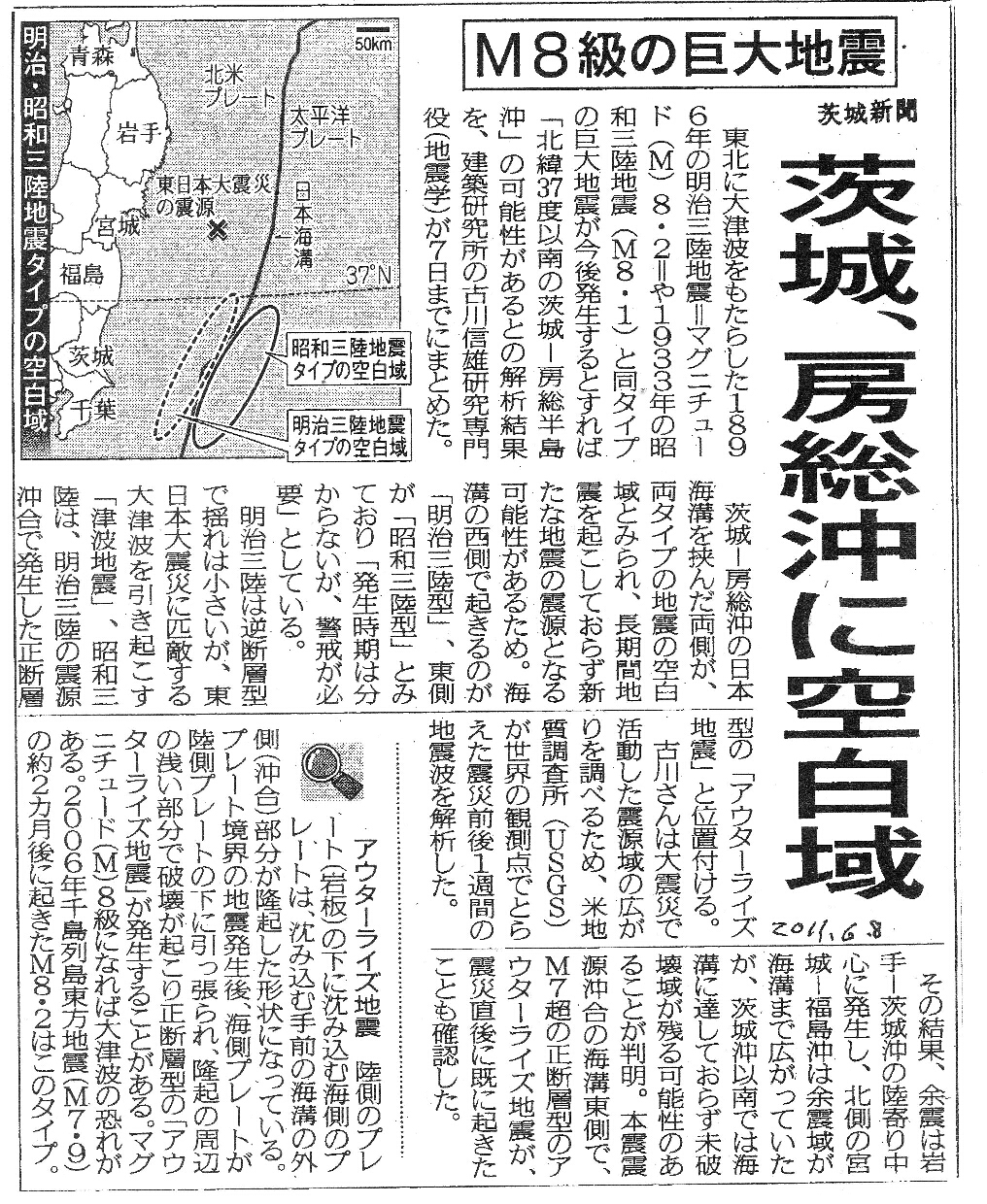 | [2011_06_08_03]M8級の巨大地震 茨城、房総沖に空白域(茨城新聞2011年6月8日) |