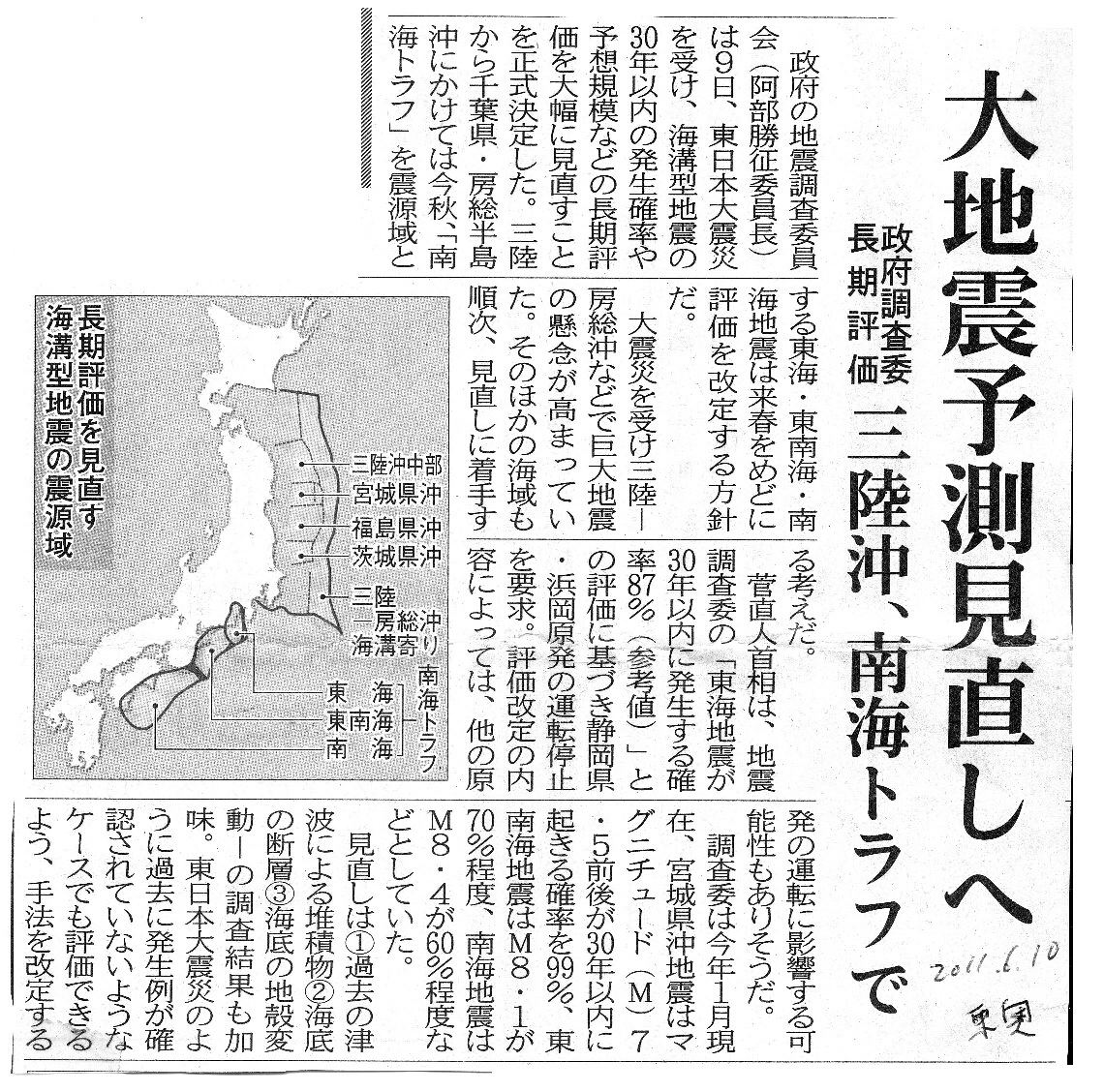 | [2011_06_10_01]大地震予測見直しへ 政府調査委長期評価 三陸沖、南海トラフで(東奥日報2011年6月10日) |