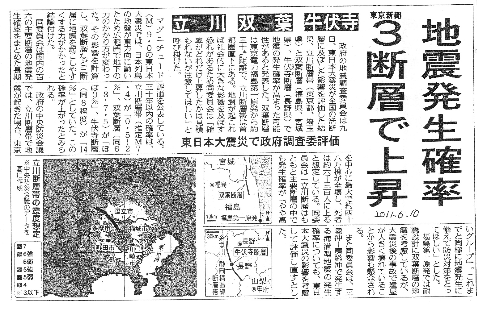 [2011_06_10_02]立川 双葉 牛伏寺 地震発生確率 3断層で上昇 東日本大震災で政府調査委評価(東京新聞2011年6月10日)