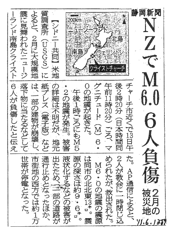 [2011_06_13_01]NZでM6.0 6人負傷 2月の被災地(静岡新聞2011年6月13日)