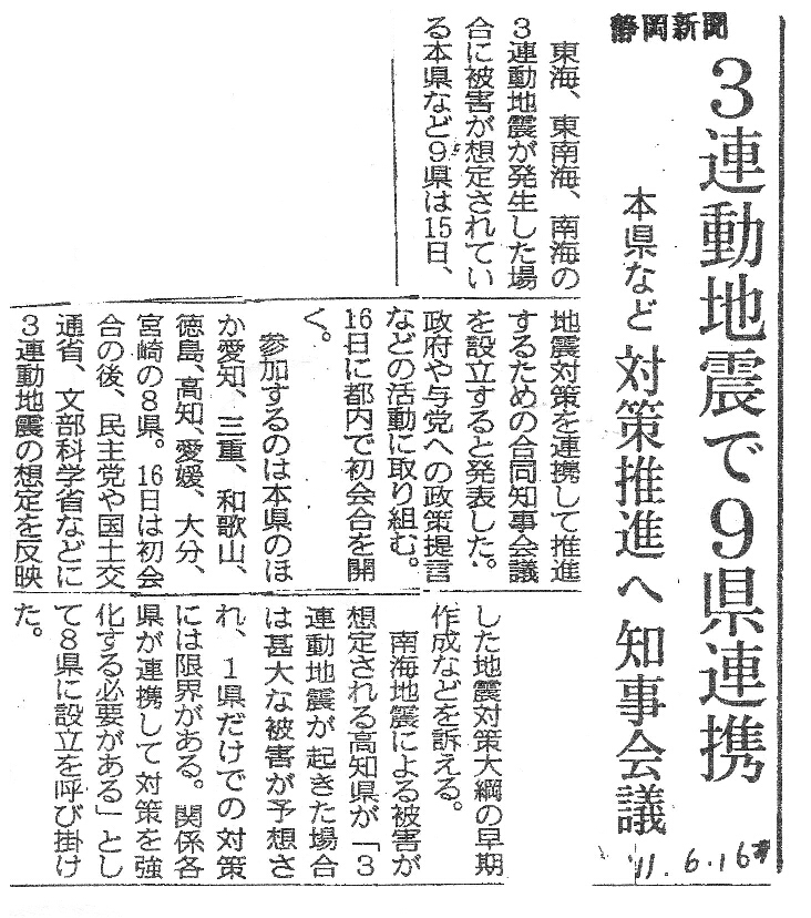 [2011_06_16_02]3連動地震で9県連携 本県など 対策推進へ知事会議(静岡新聞2011年6月16日)