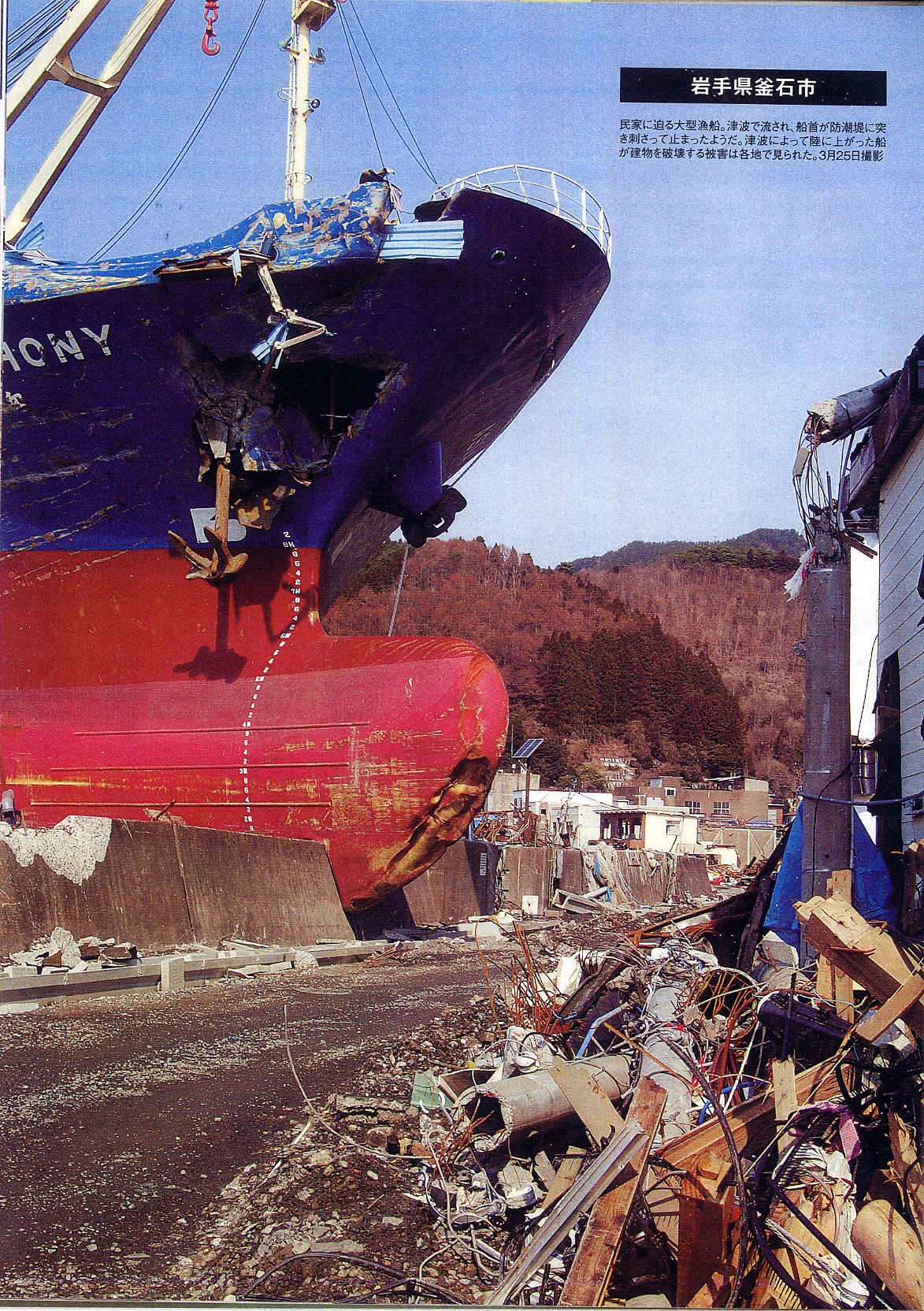 [2011_06_27_02]東日本大震災の教訓 土木編 防潮堤に突き刺さる大型貨物船(日経BP2011年6月27日)