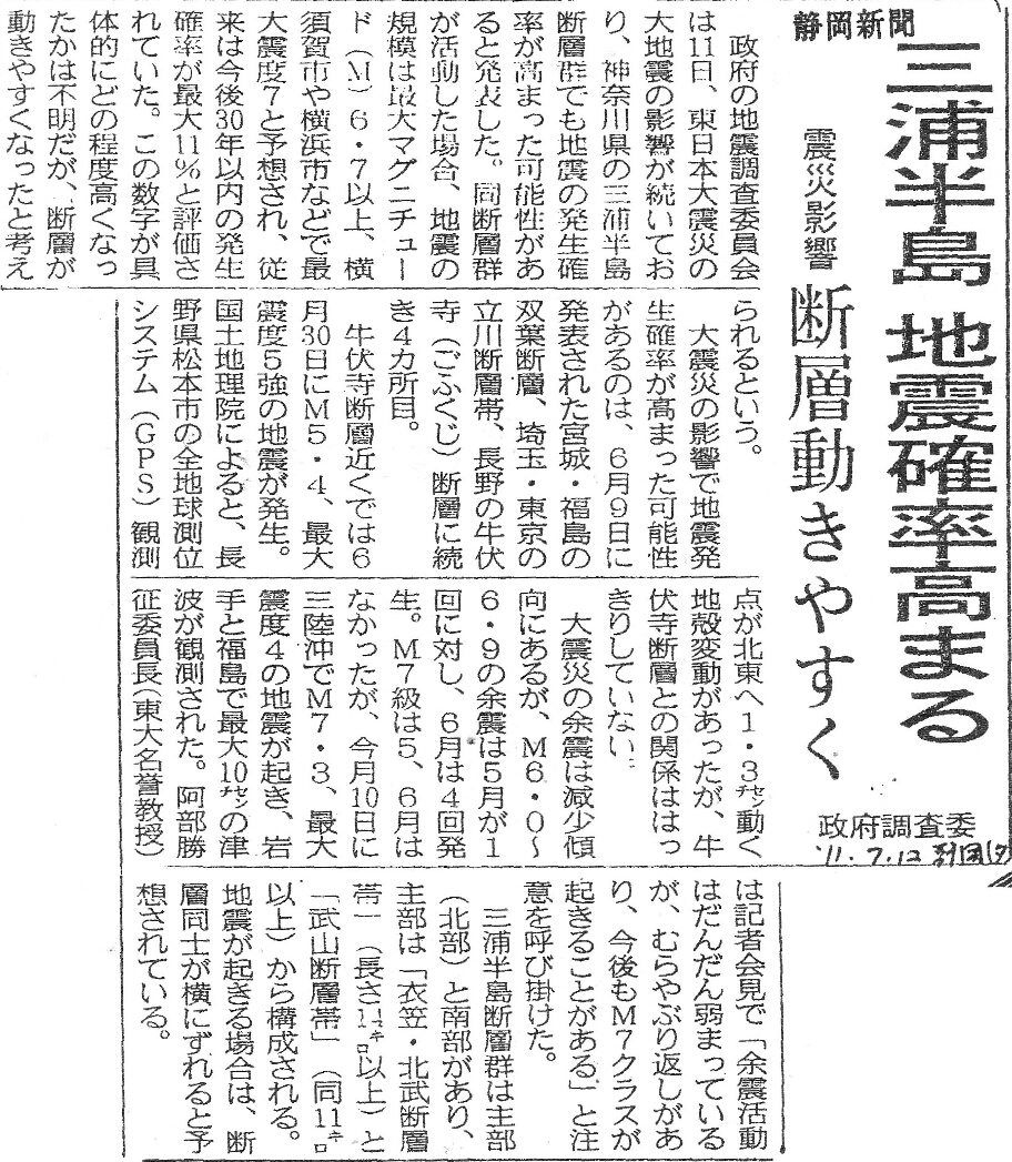 | [2011_07_12_01]三浦半島 地震確率高まる 震災影響 断層動きやすく 政府調査委(静岡新聞2011年7月12日) |