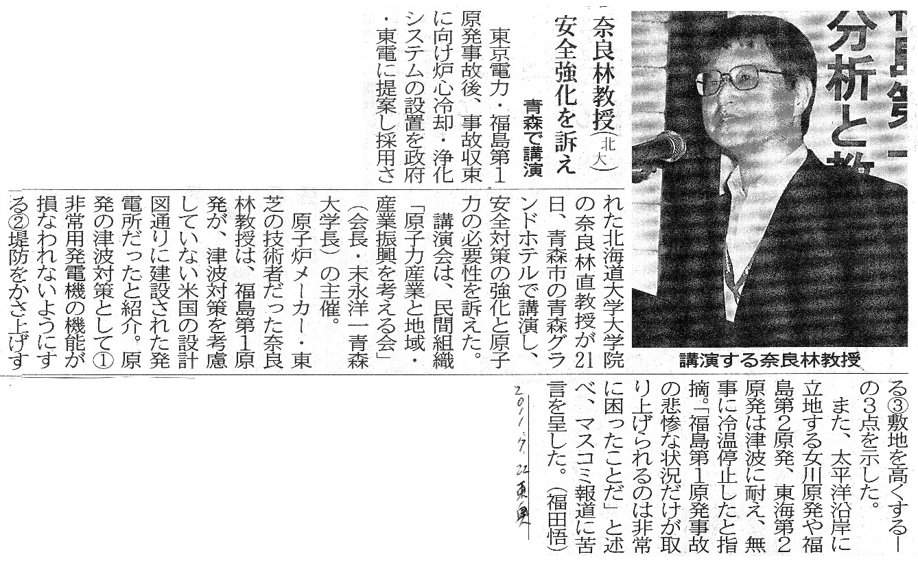 [2011_07_22_01]奈良林教授北大 安全強化を訴え 青森で講演(東奥日報2011年7月22日)